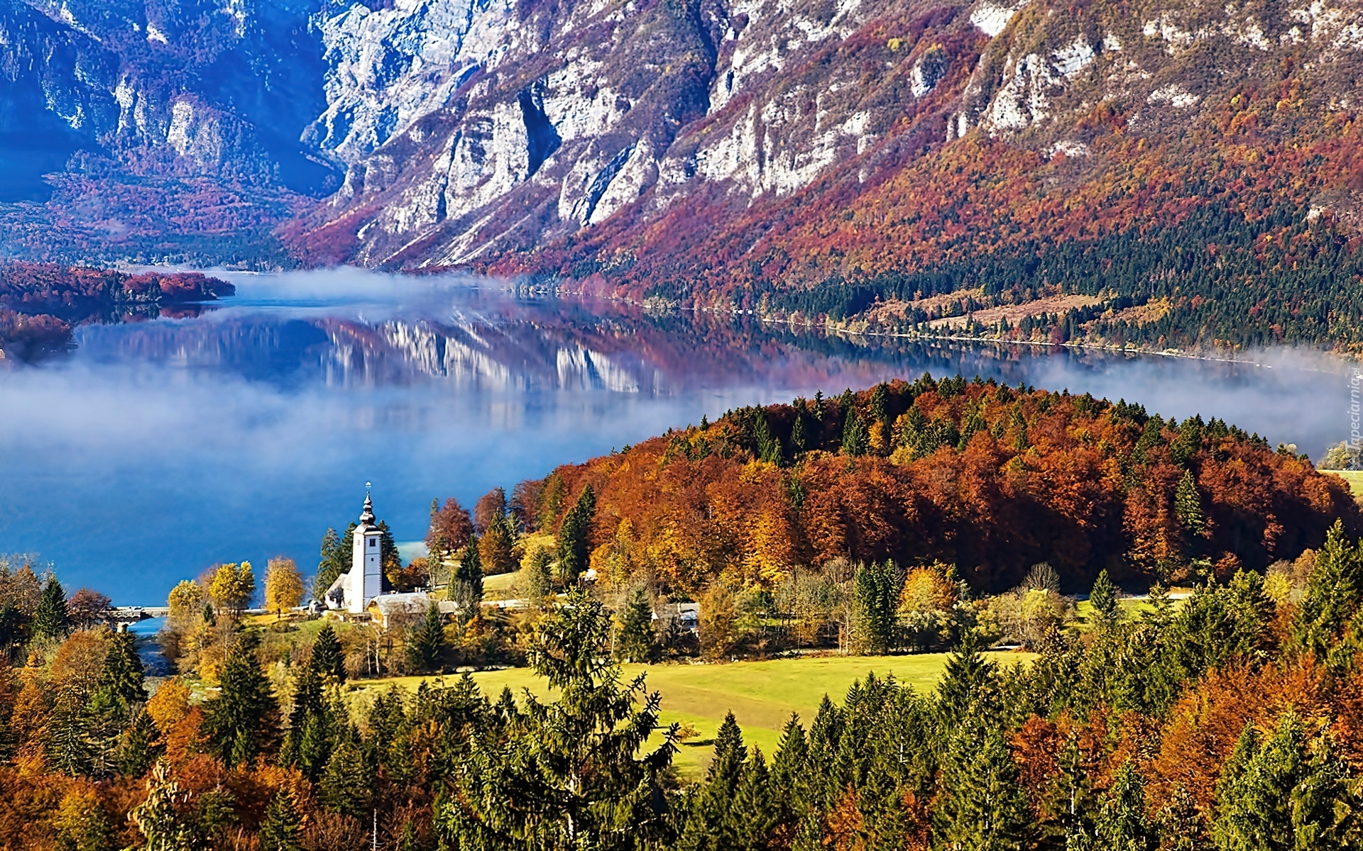 Edytor tapety: Góry, Jezioro, Bohinj, Las, Kościół, Jesień