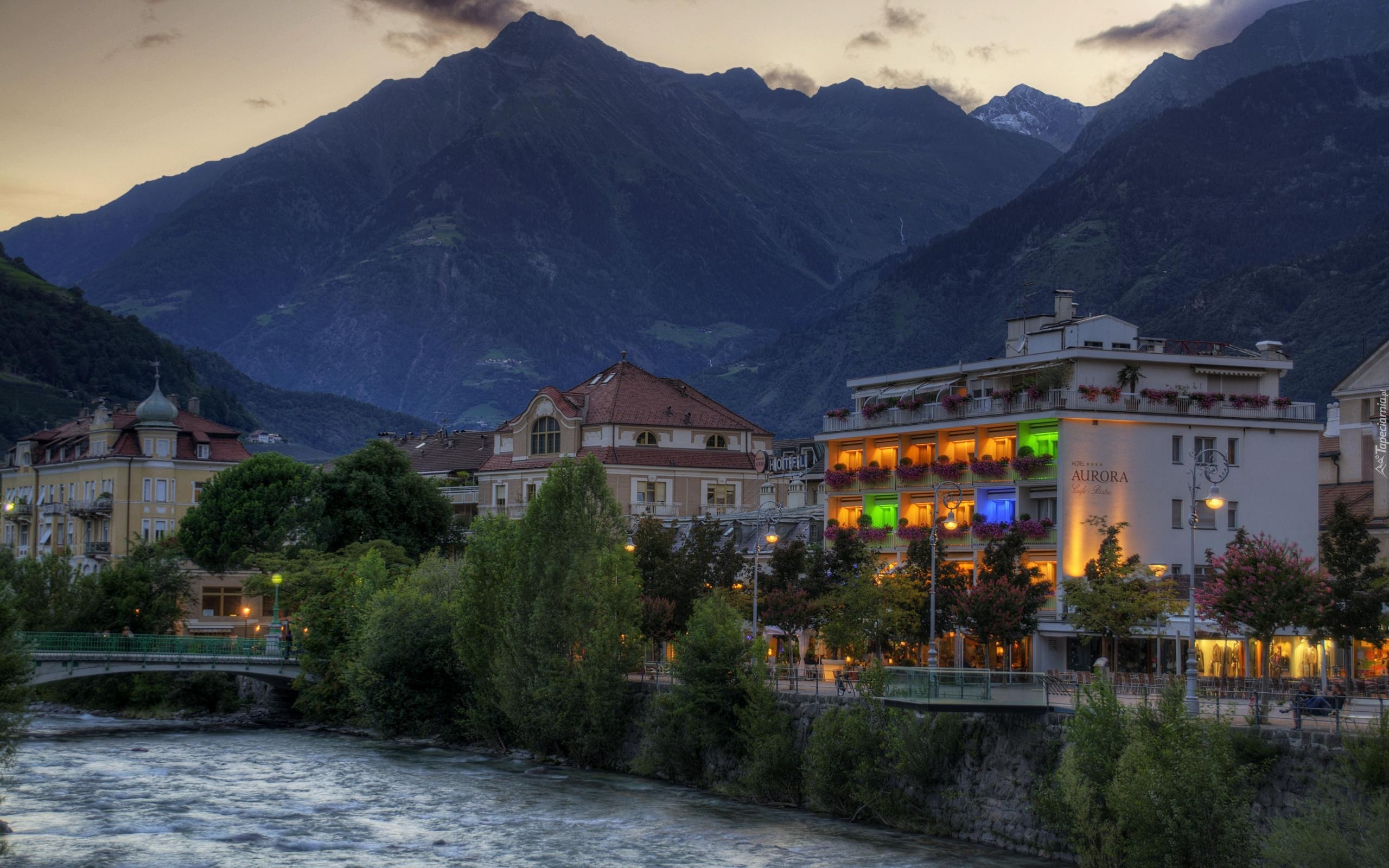 Edytor tapety: Włochy, Merano, Domy, Mostek, Rzeka, Góry