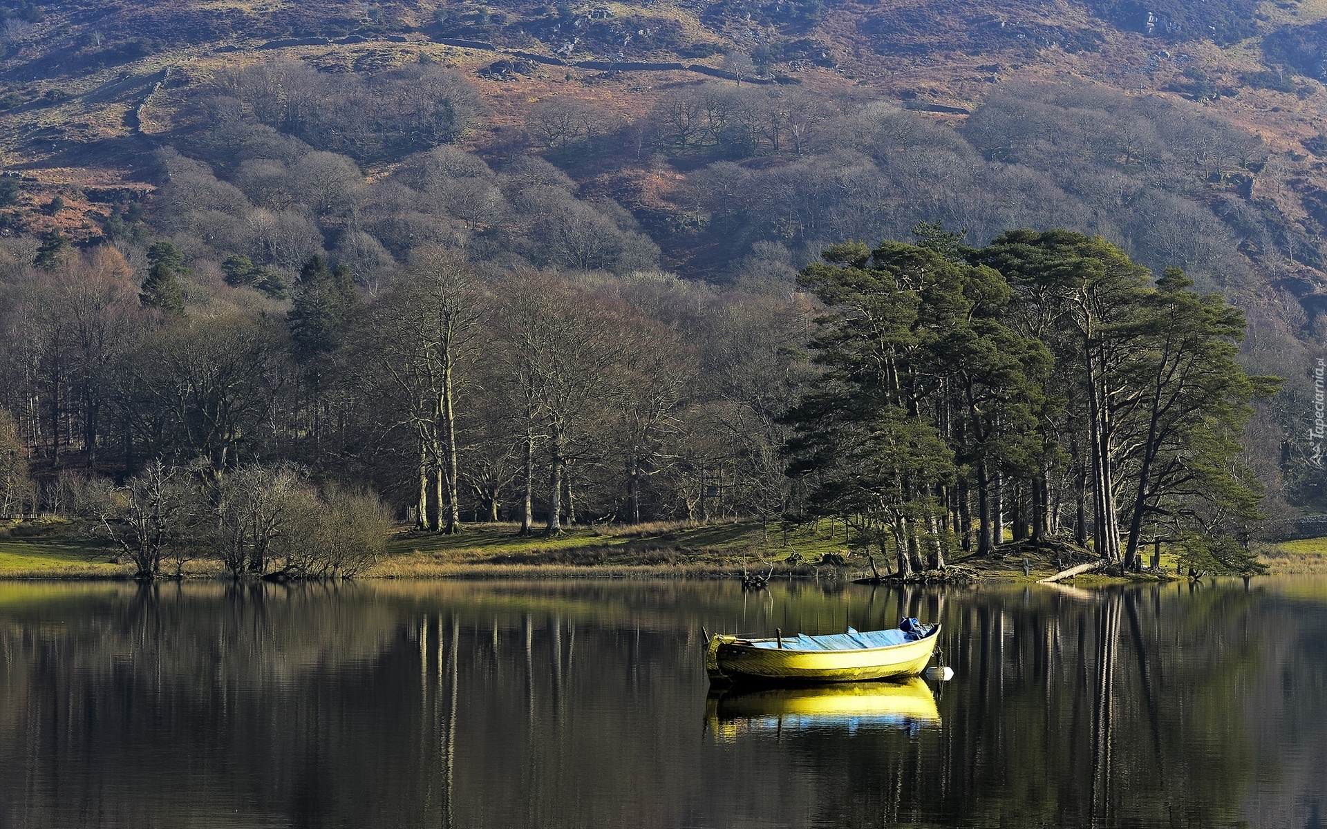 Edytor tapety: Jezioro, Łódka, Drzewa, Góry