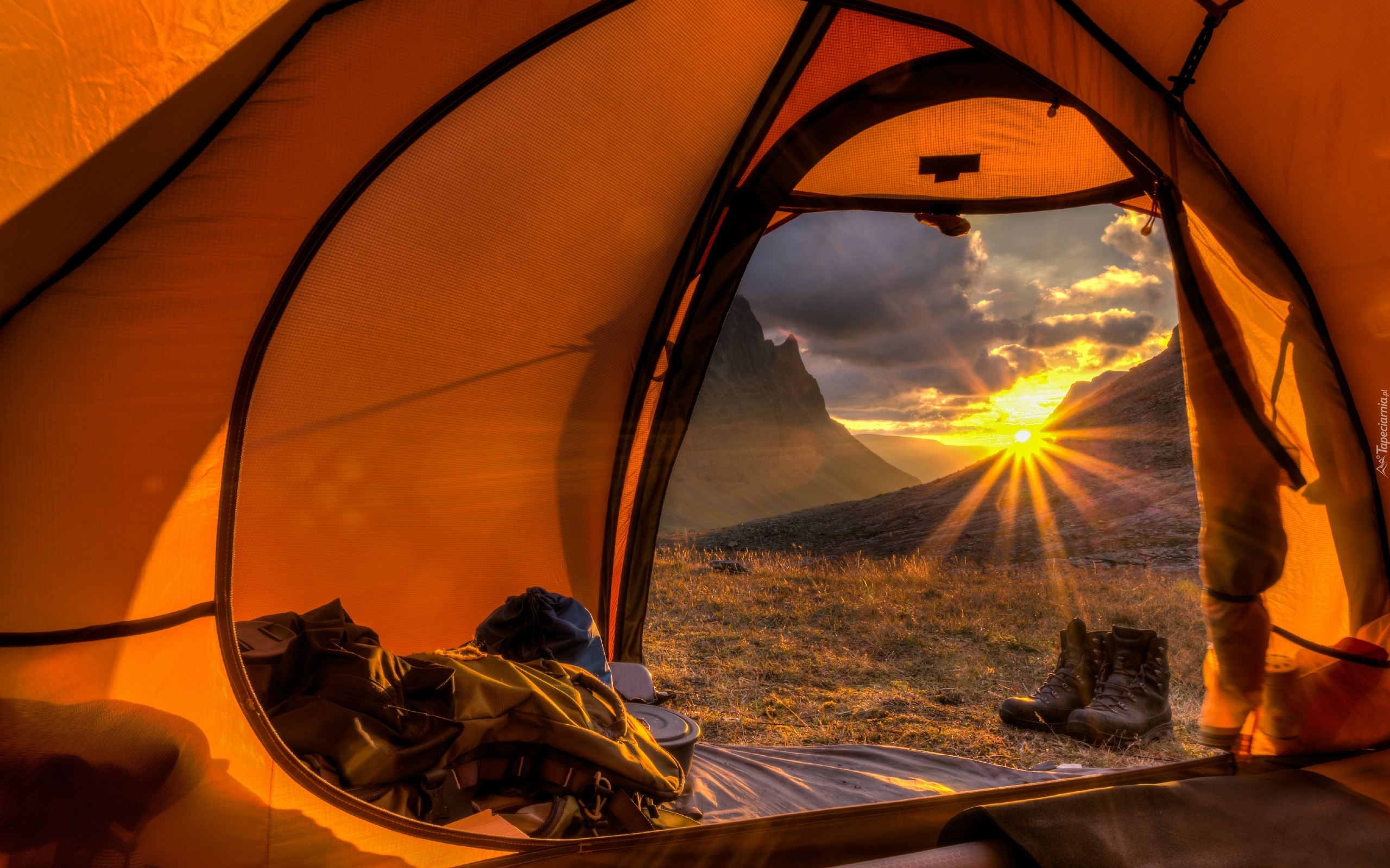 Edytor tapety: Namiot, Widok, Na, Góry, Promienie, Słońca, Chmury
