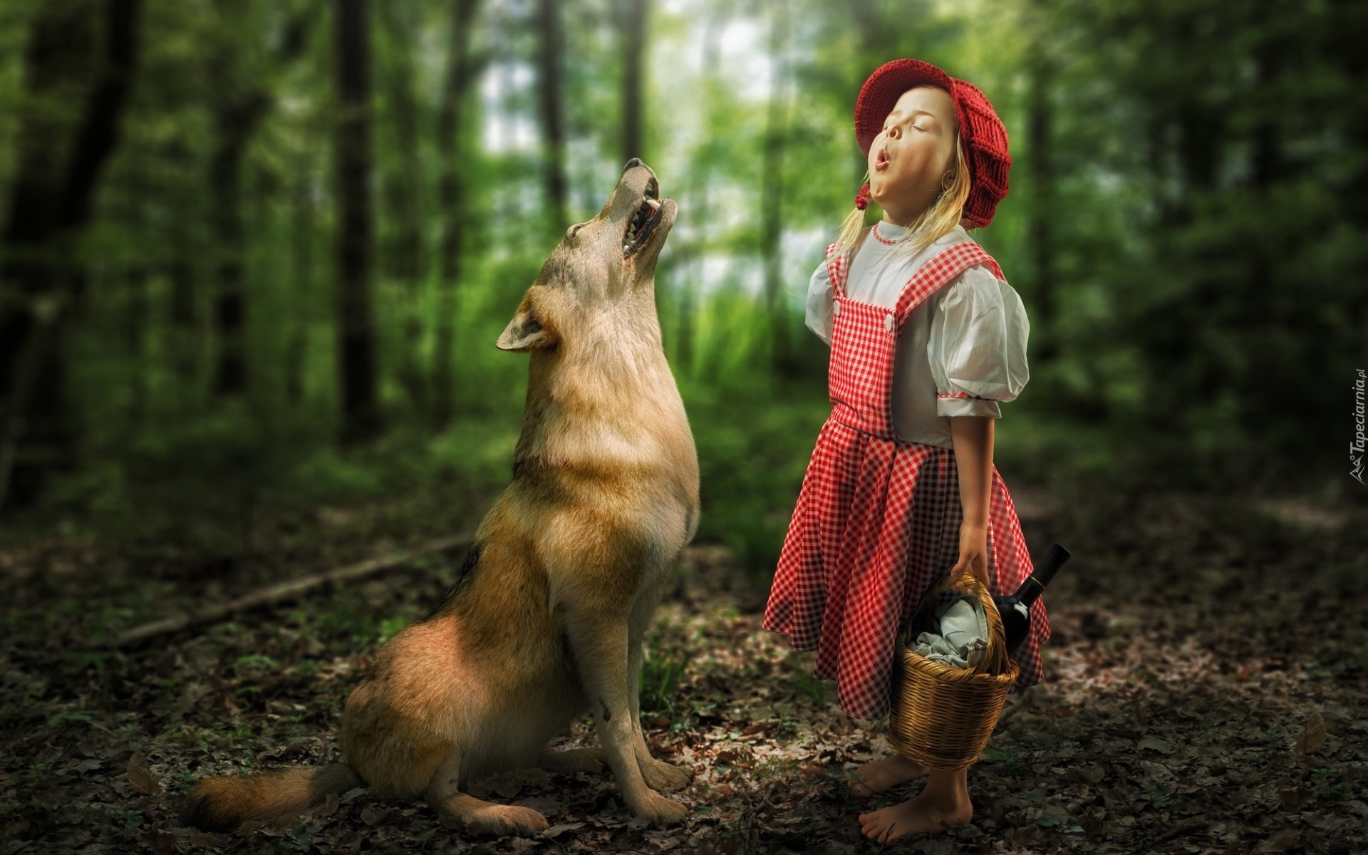 Edytor tapety: Dziewczynka, Czerwony, Kapturek, Koszyczek, Wilk, Las