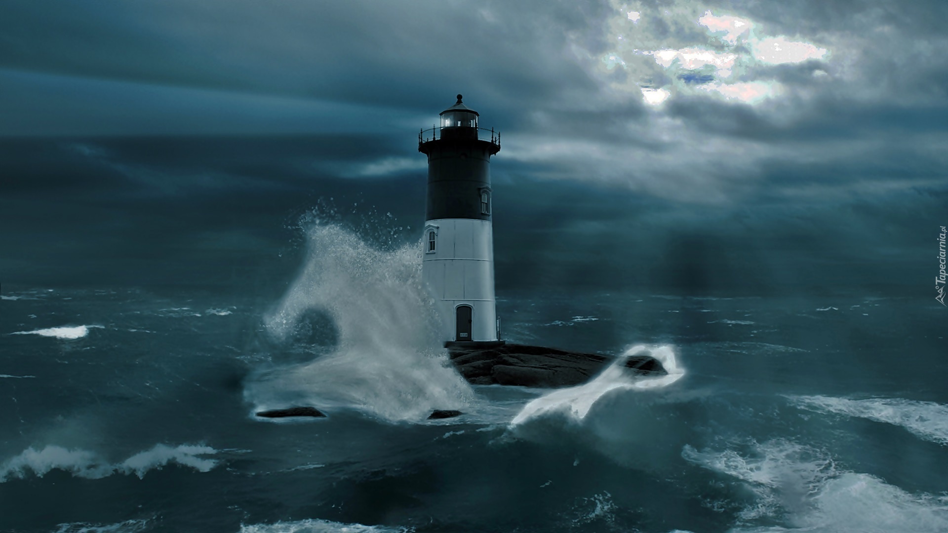 Edytor tapety: Latarnia, Morska, Fale, Chmury, Przebijające, Światło