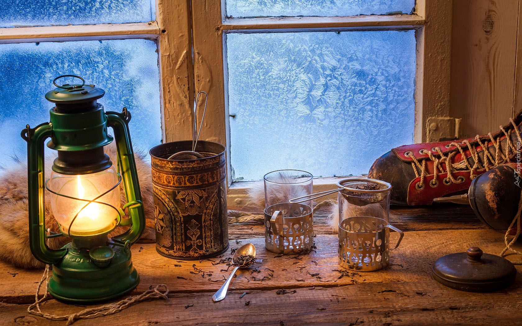 Edytor tapety: Kompozycja, Lampa, Okno, Mróz, Herbata, Szklanki, Łyżwa