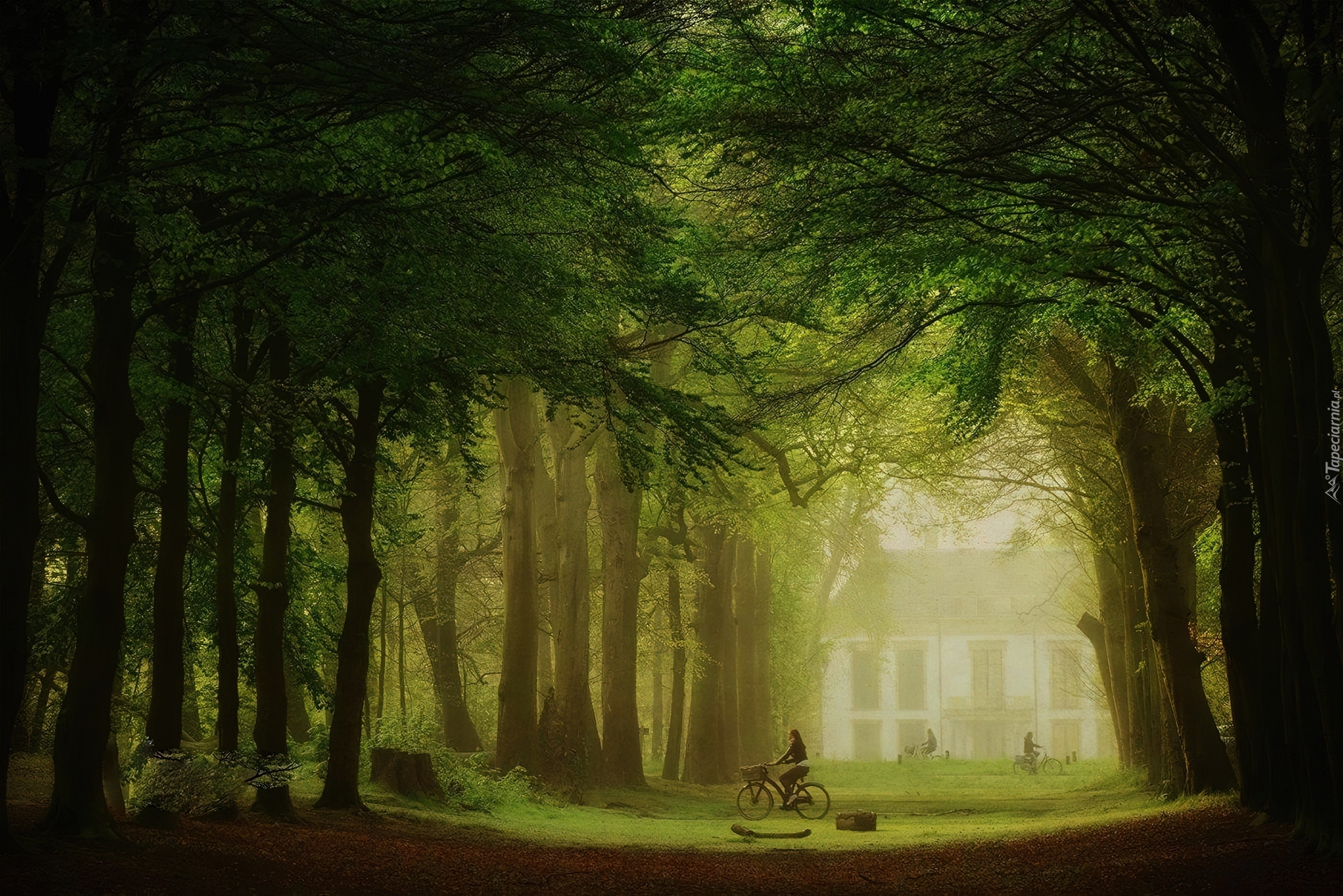 Edytor tapety: Drzewa, Mgła, Rowerzystka, Dom