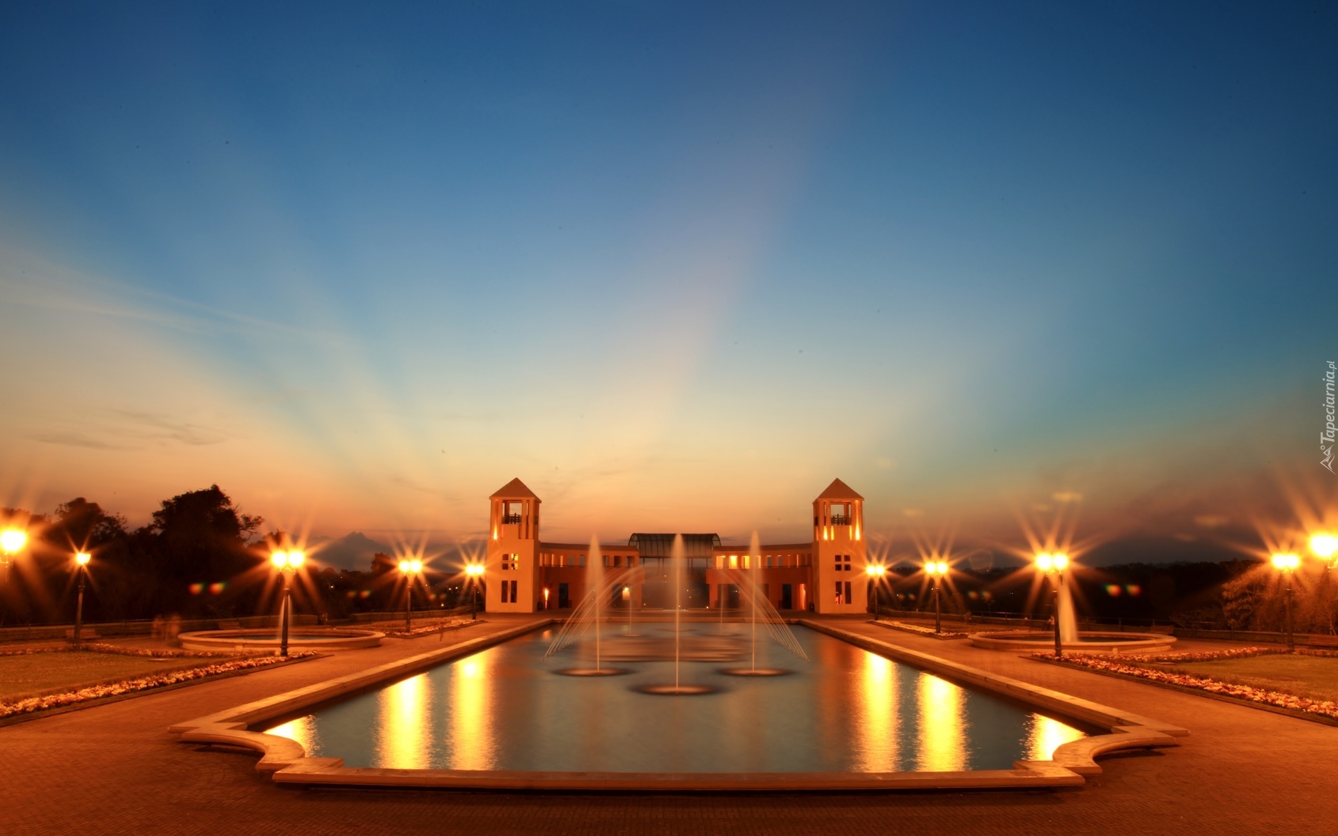 Edytor tapety: Zachód, Słońca, Fontanny, Basen, Latarnie