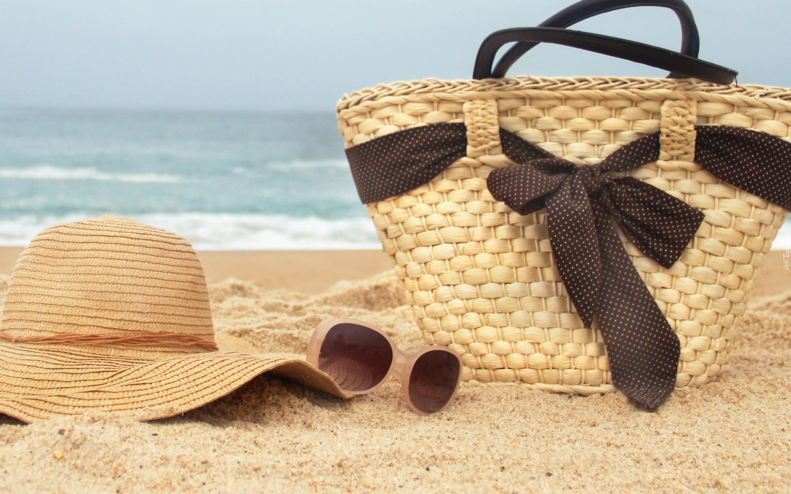 Edytor tapety: Plaża, Morze, Koszyk, Kapelusz, Okulary, Lato