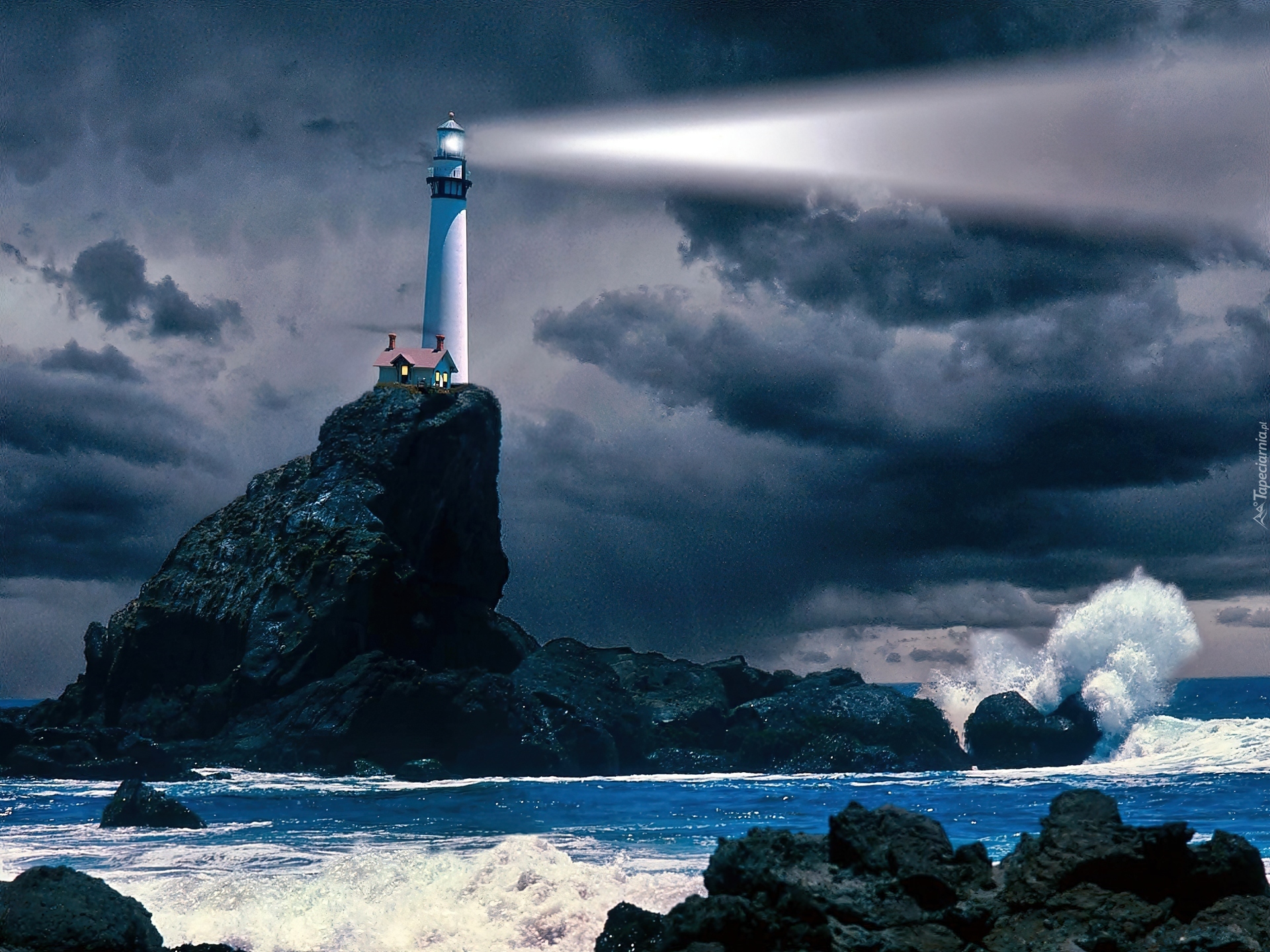 Edytor tapety: Skała, Latarnia, Morska, Fale, Ciemne, Chmury