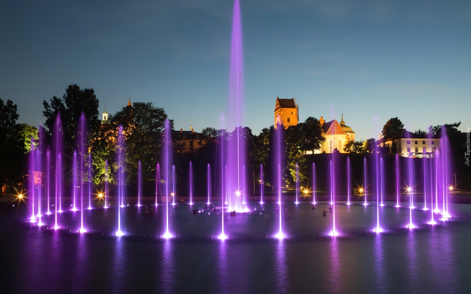 Edytor tapety: Fontanna, Budynki, Miasto, Zmrok