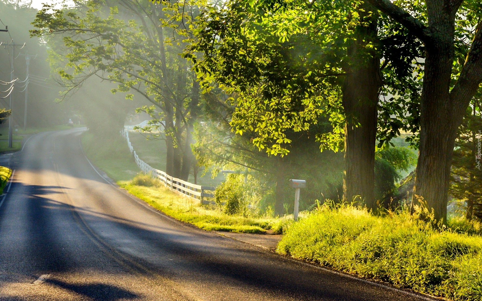 Edytor tapety: Droga, Drzewa, Poranek, Mgła