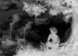 Edytor tapety: Malarstwo, Obraz, Chłopiec, Drzewo, Fabryki, Kominy, Dym