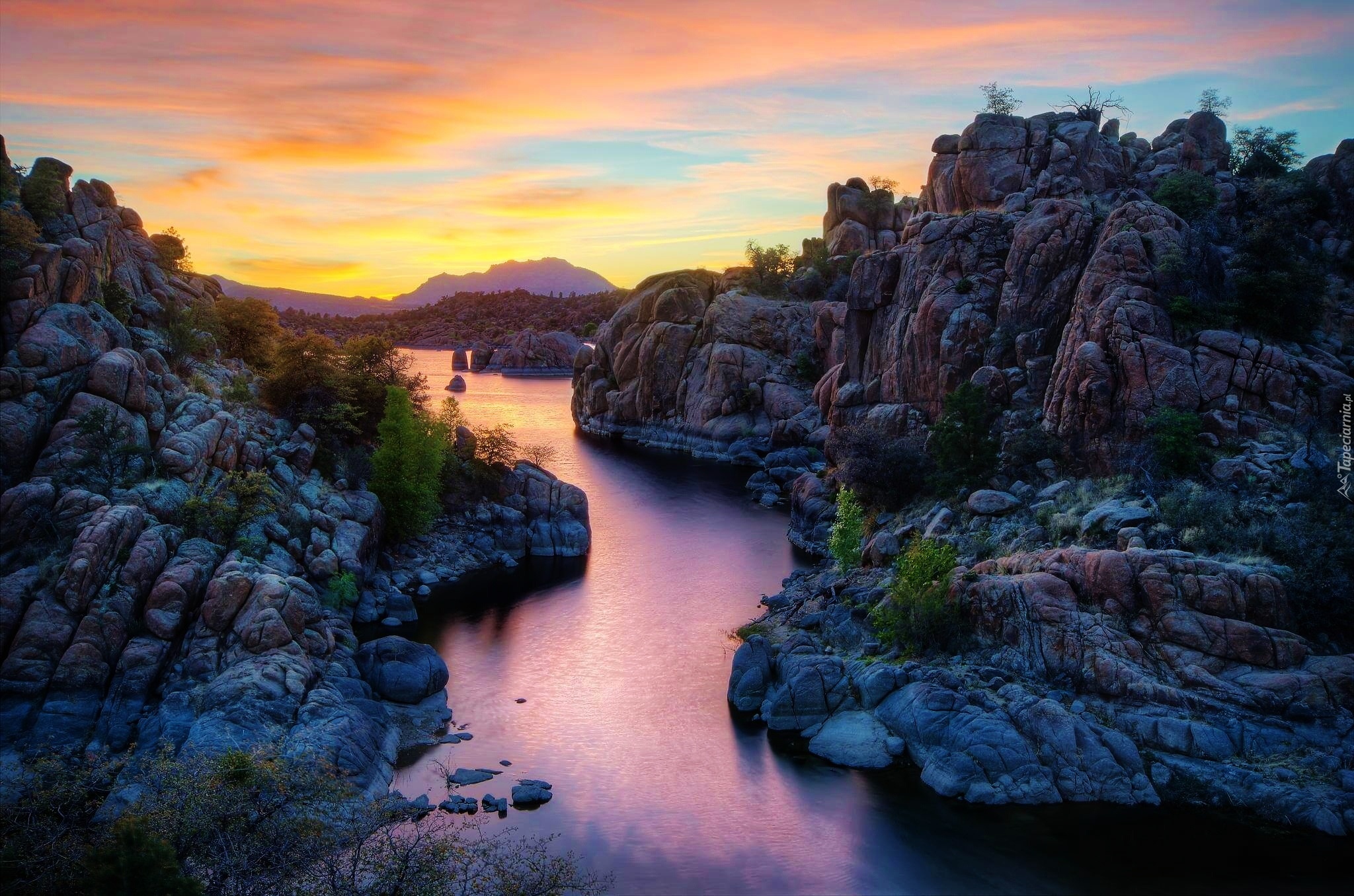 Edytor tapety: Zachód, Słońca, Skały, Rzeka