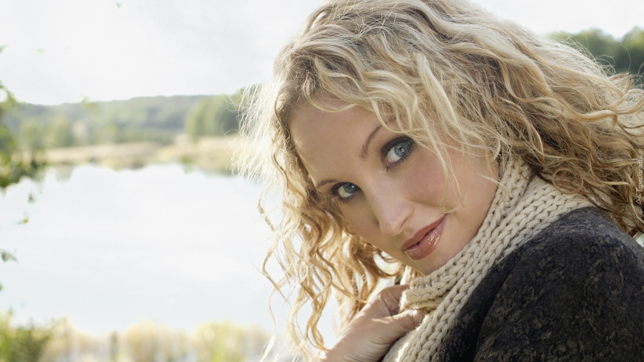 Edytor tapety: Blondynka, Kobieta, Spojrzenie, Makijaż, Szalik