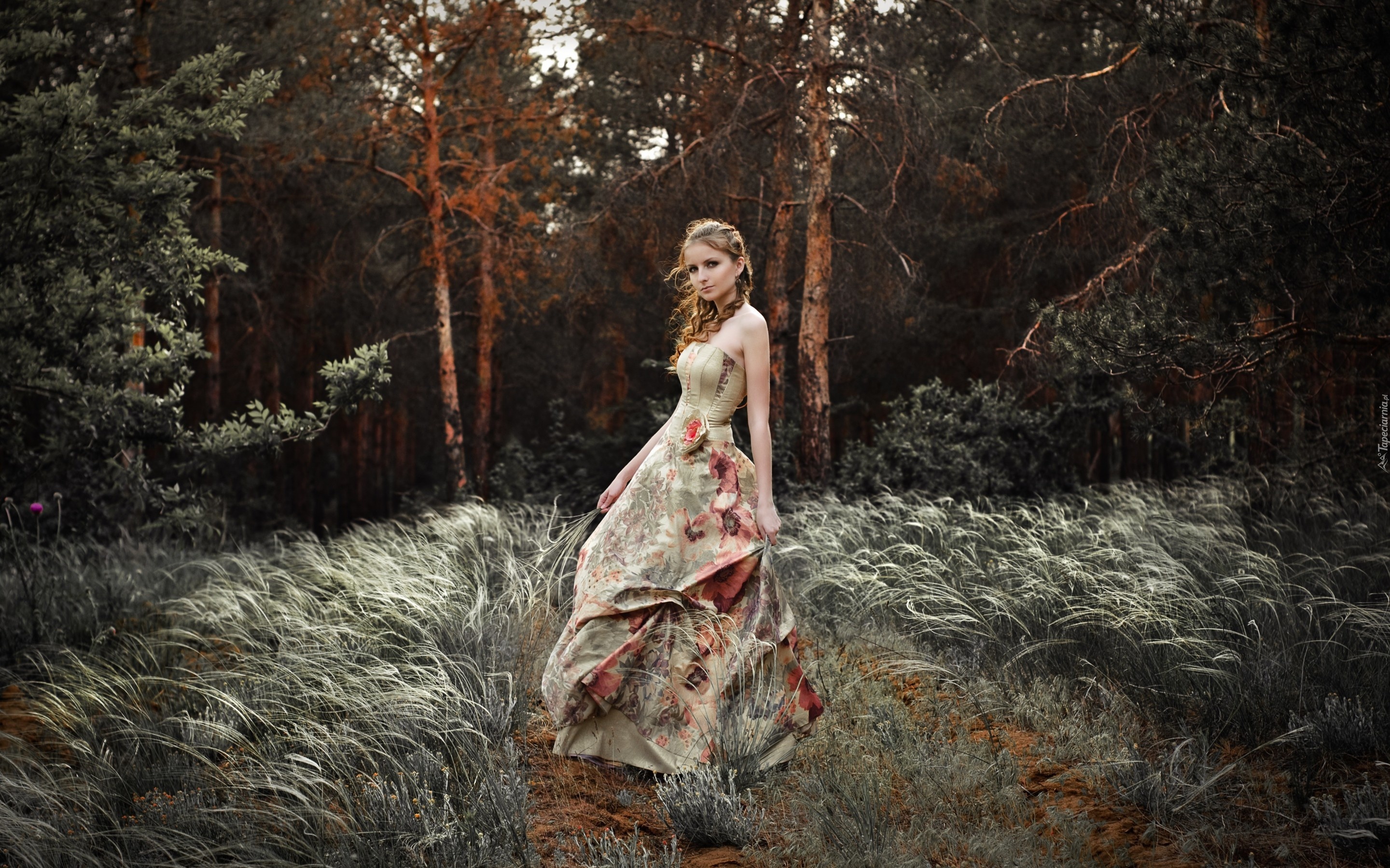Edytor tapety: Las, Polana, Sucha, Trawa, Kobieta, Długa, Sukienka