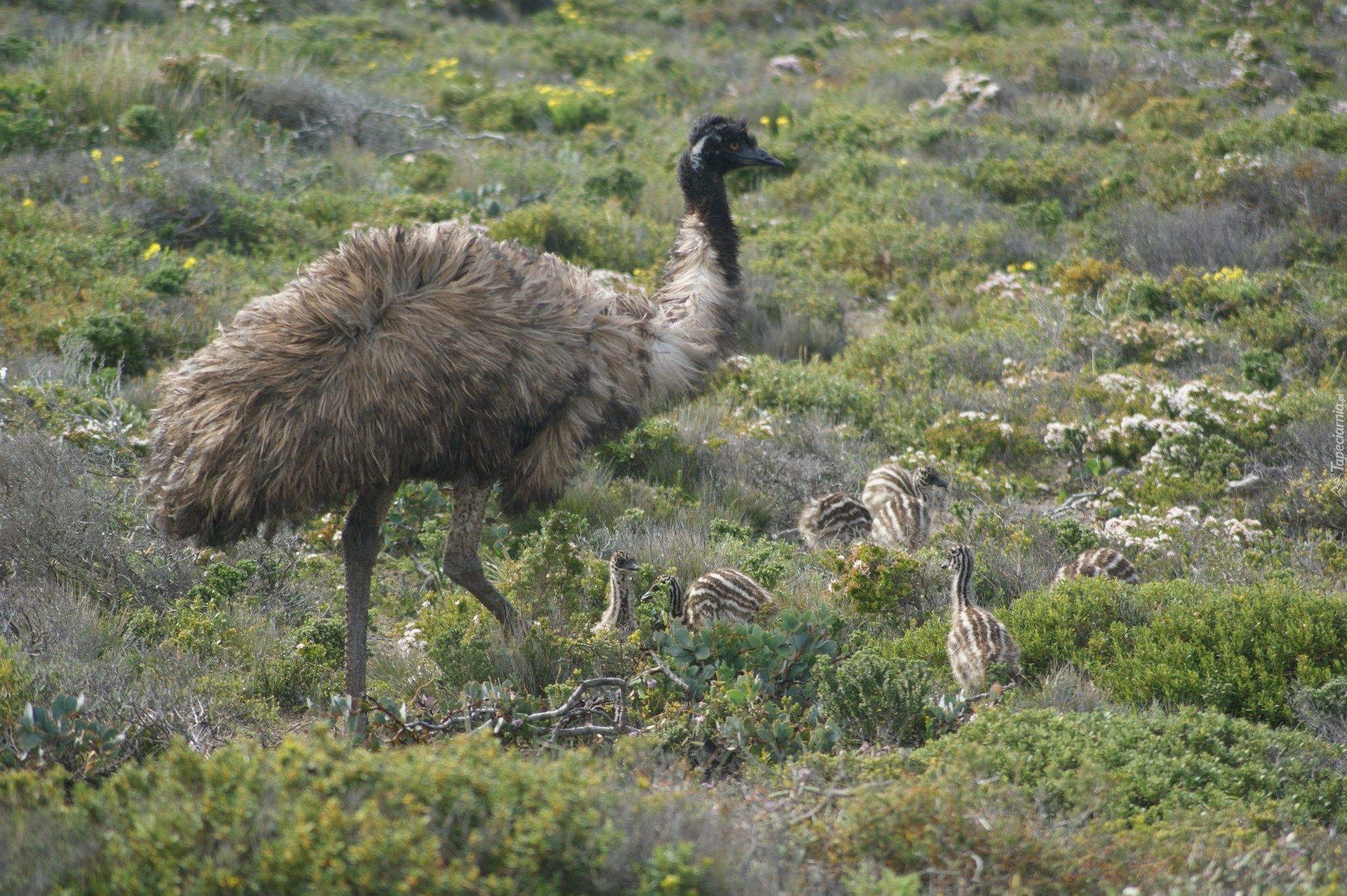 Edytor tapety: Struś, Emu, Pisklęta, Rośliny