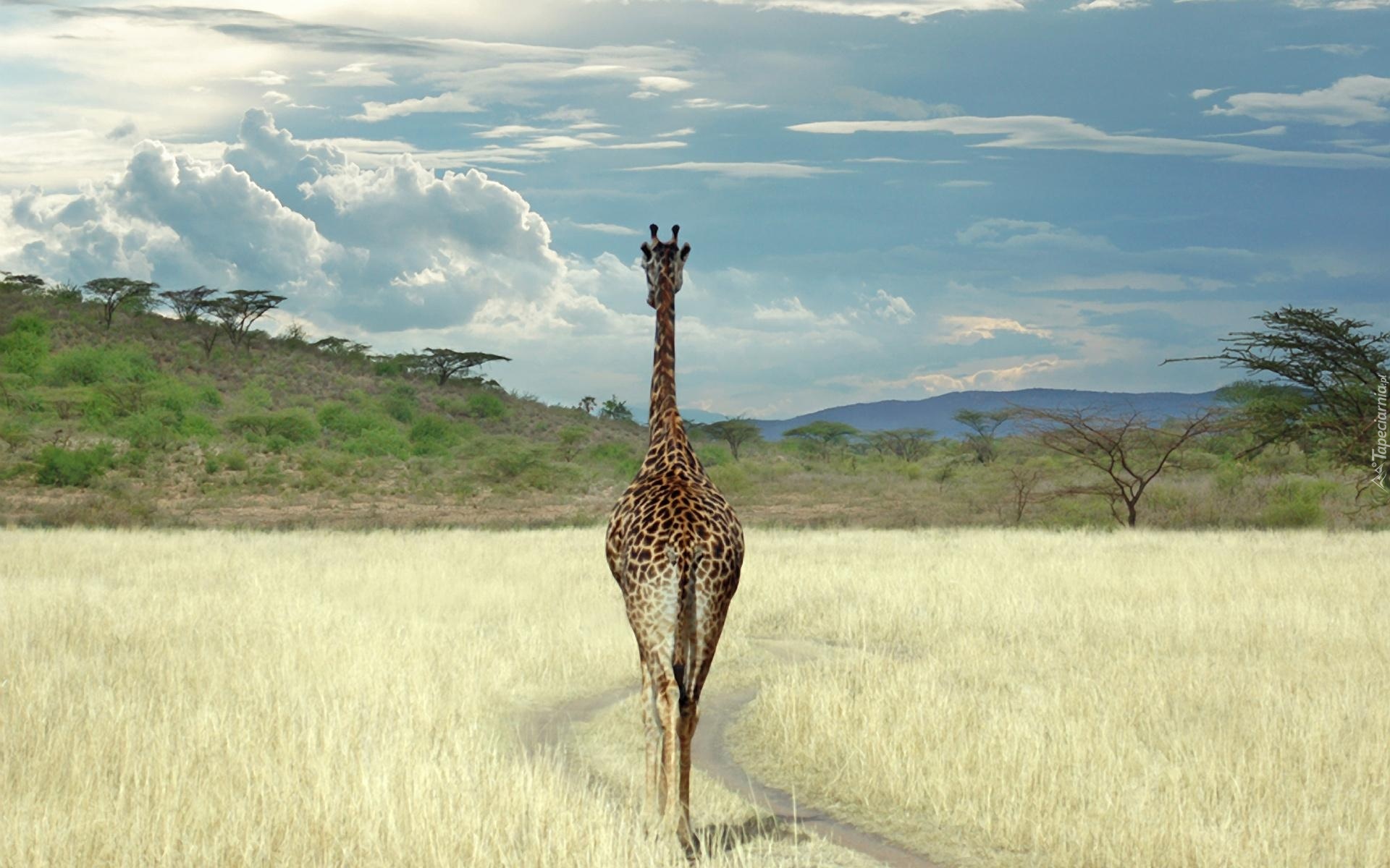 Edytor tapety: Żyrafa, Sawanna, Drzewa, Trawa