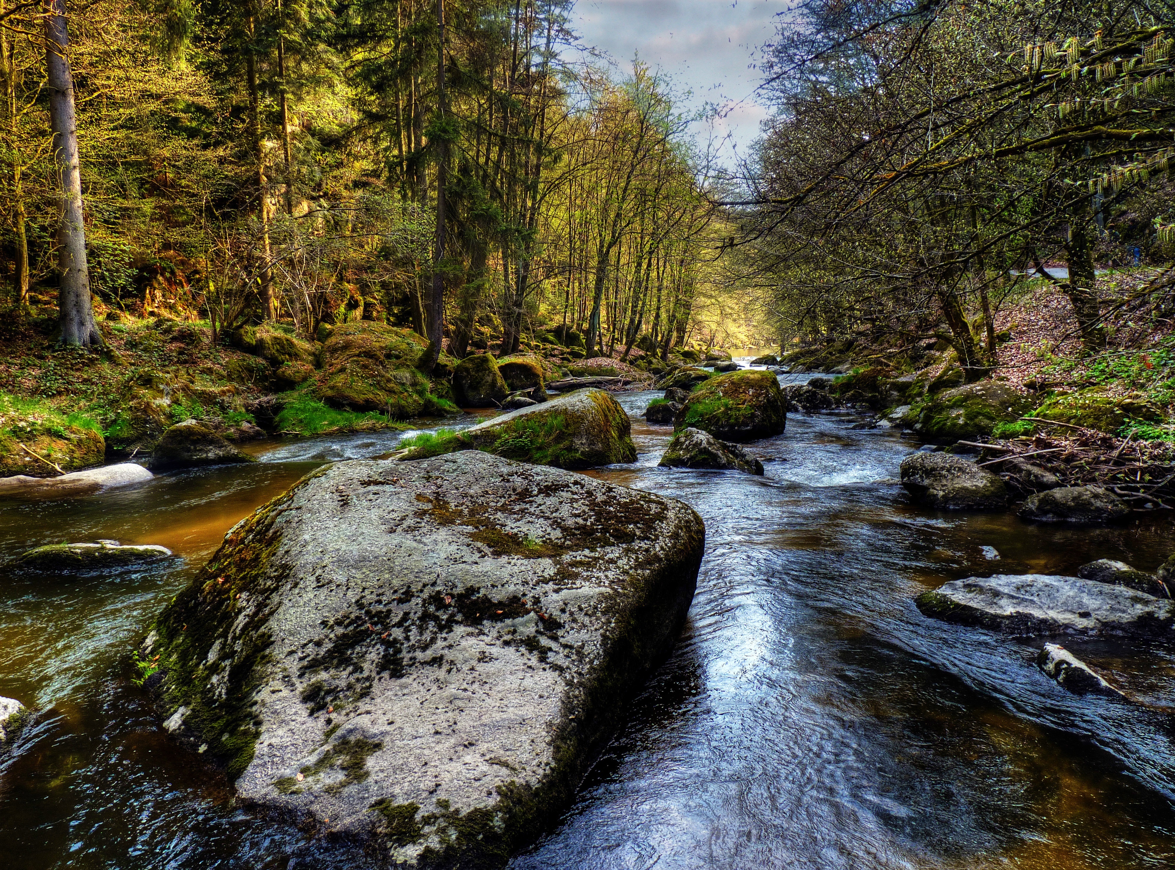 Edytor tapety: Las, rzeka, Omszone, Kamienie