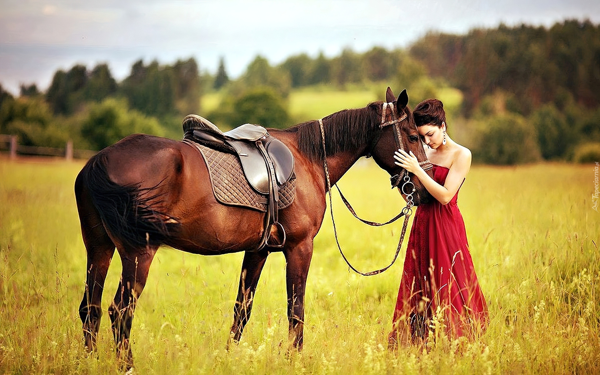 Edytor tapety: Koń, Siodło, Kobieta, Czerwona, Sukienka, Łąka