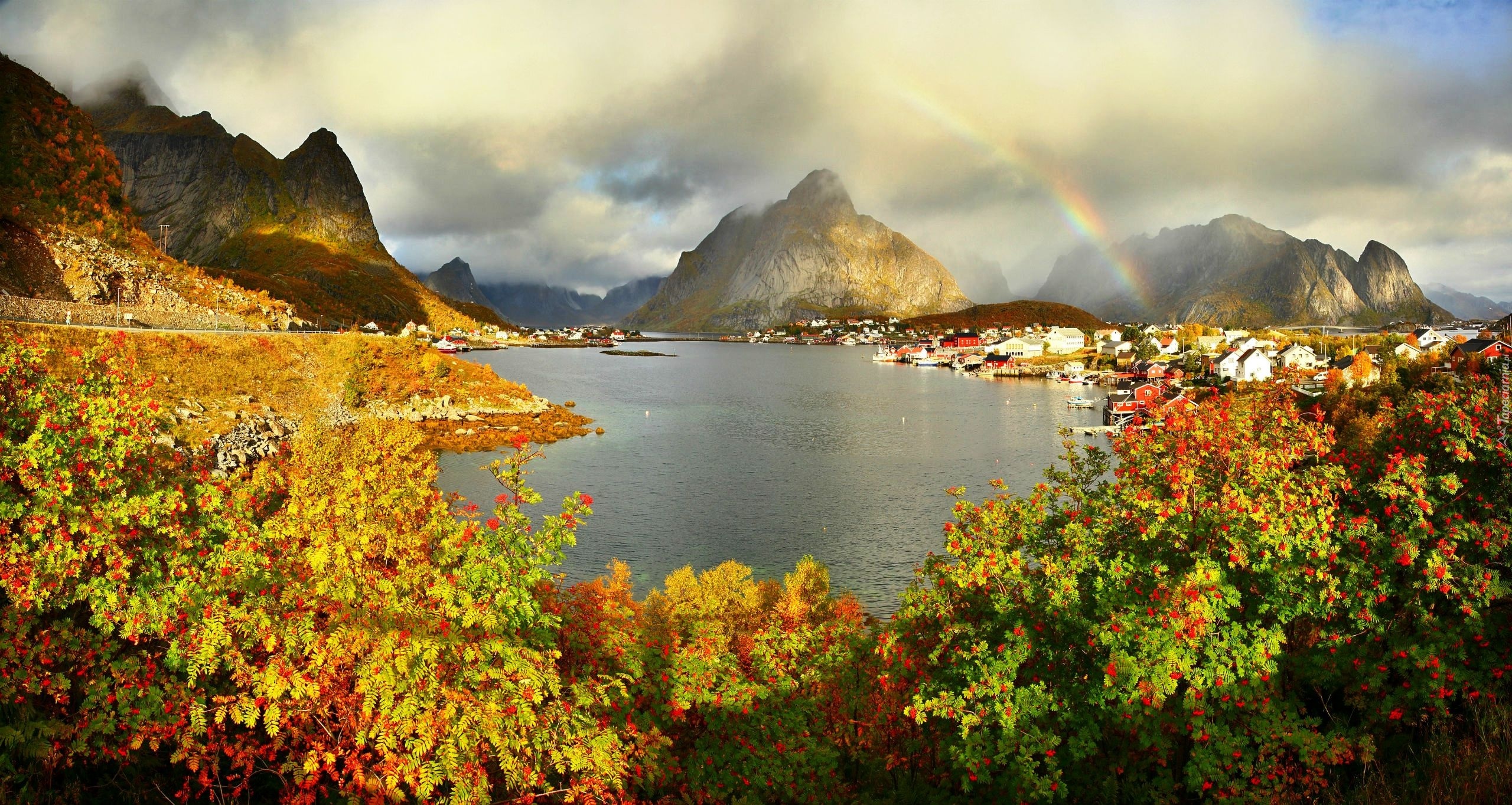 Edytor tapety: Góry, Jezioro, Tęcza, Kwitnące, Krzewy