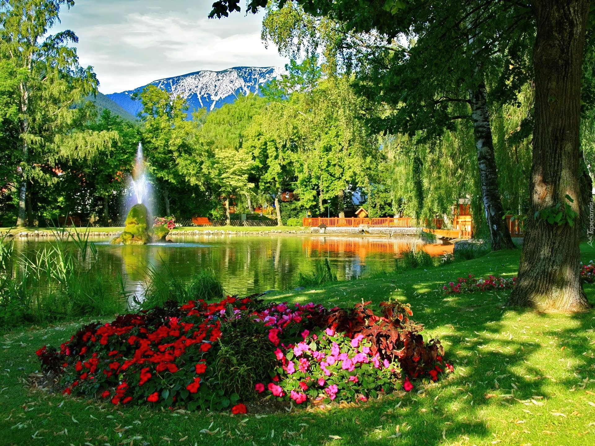 Edytor tapety: Park, Staw, Fontanna, Kwiaty, Drzewa, Góry, Lato