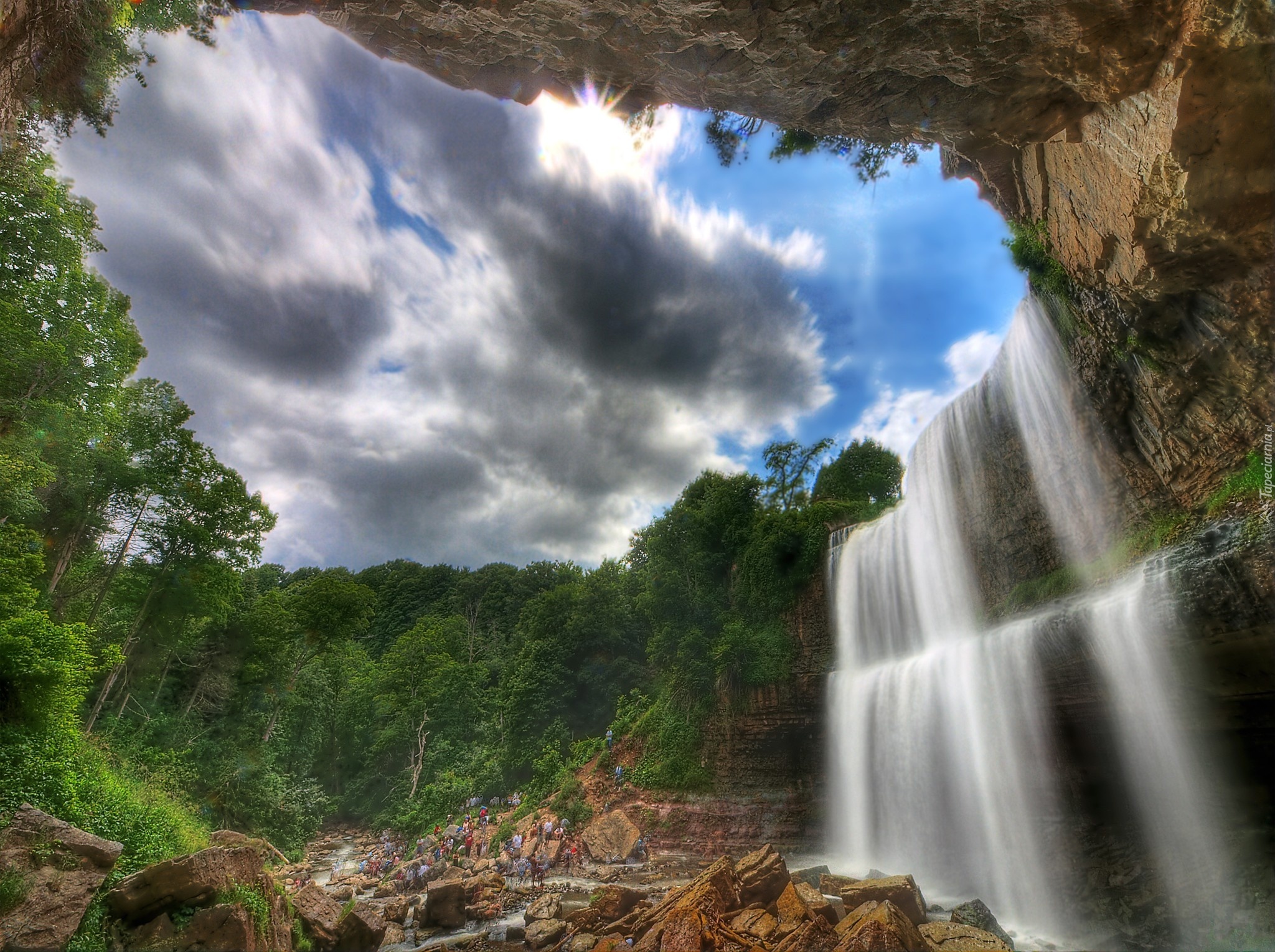 Edytor tapety: Wodospad, Skały, Chmury, Drzewa