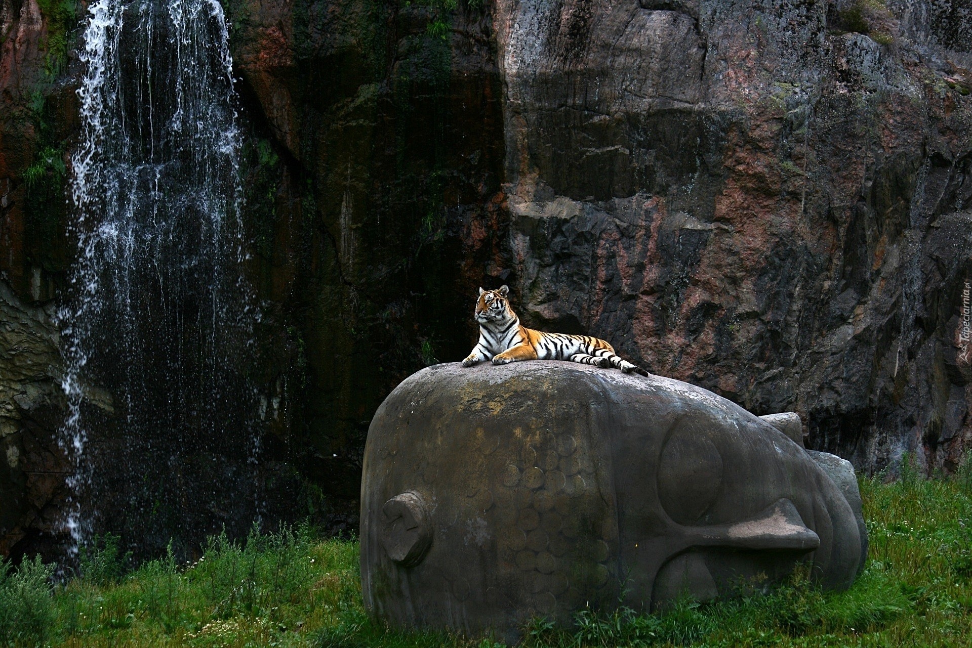 Edytor tapety: Wodospad, Skały, Posąg, Tygrys