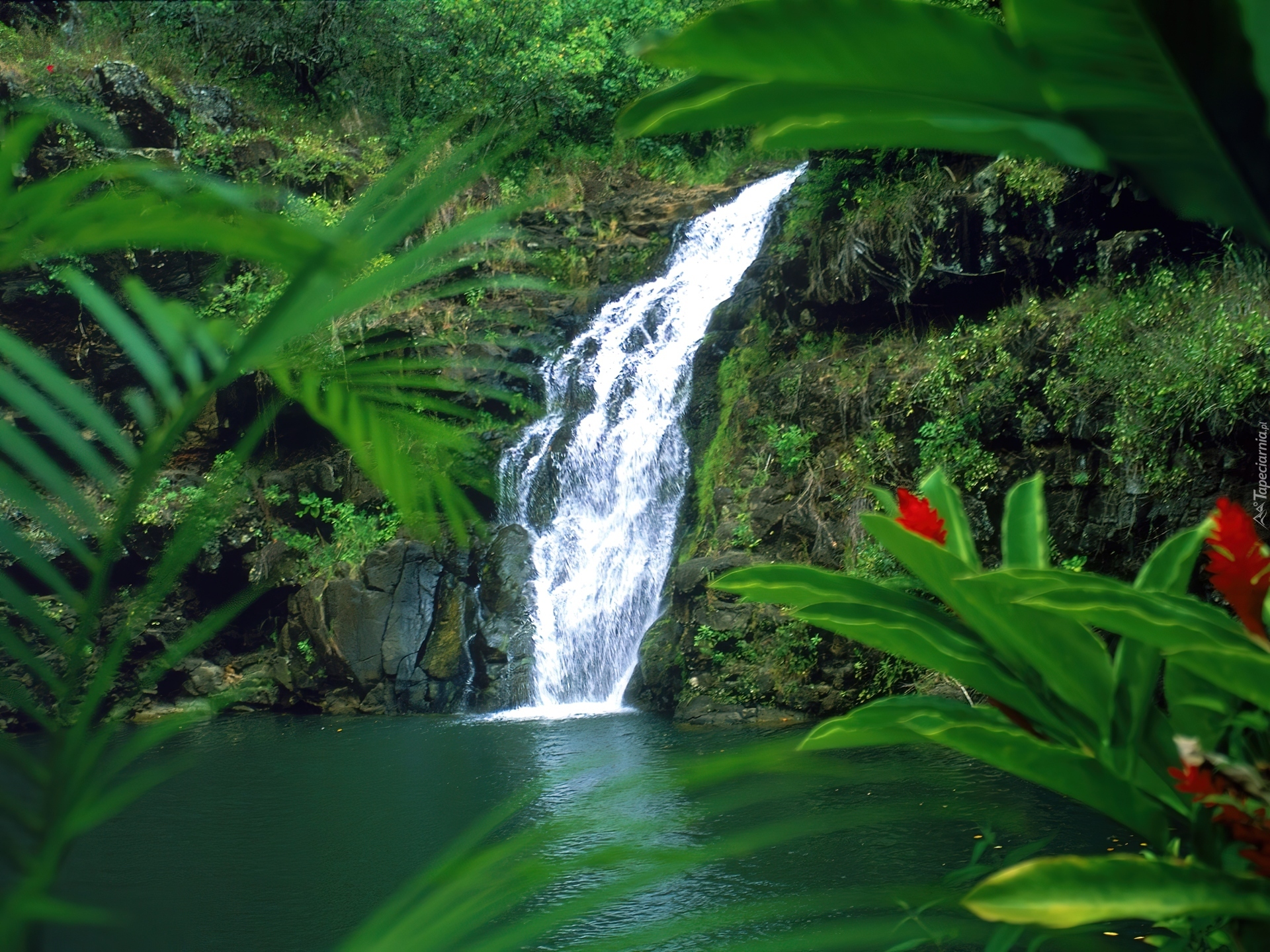 Edytor tapety: Wodospad, Czerwone, Kwiaty, Palmy, Rośliny