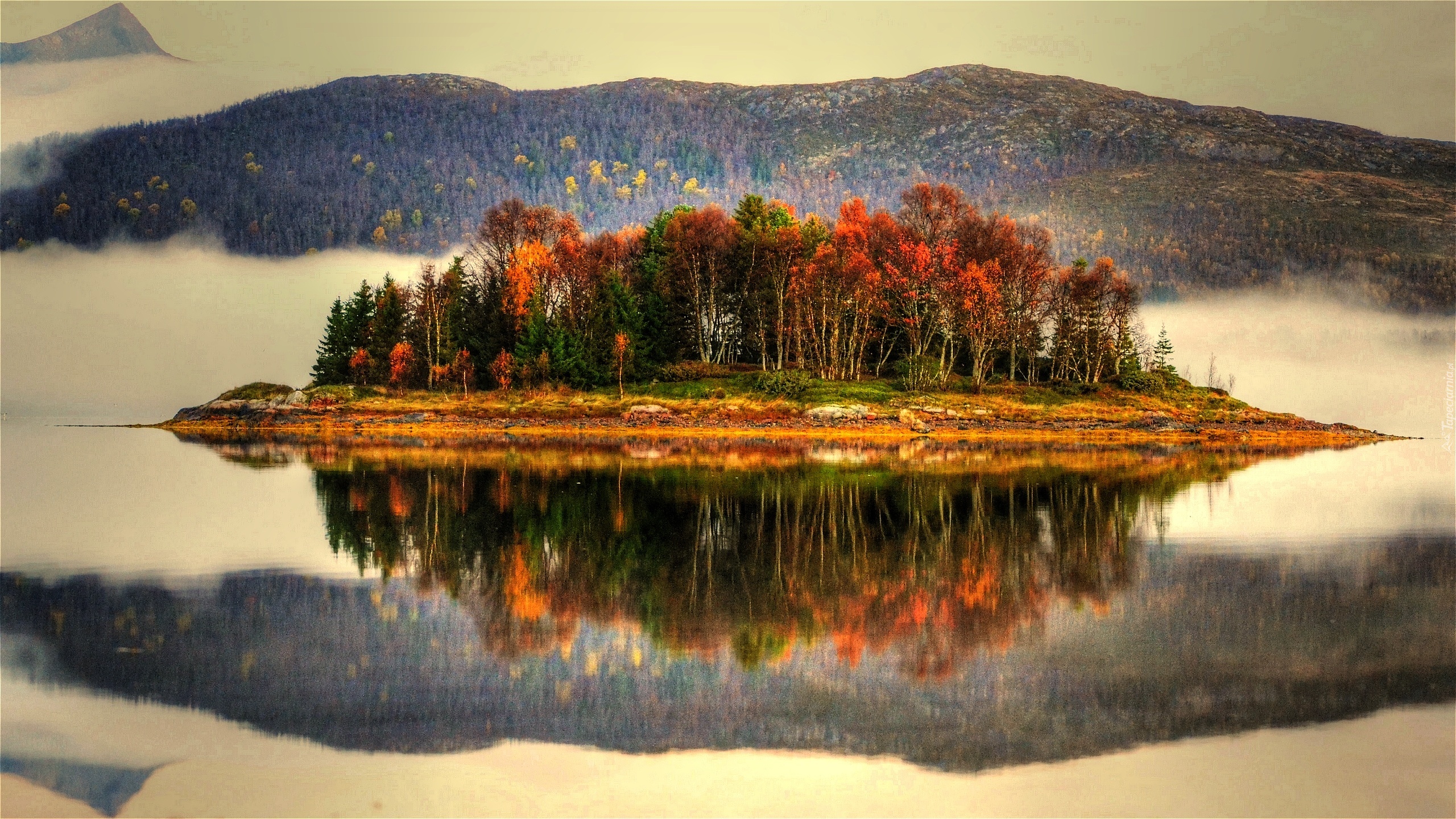 Edytor tapety: Jezioro, Las, Wyspa, Mgła