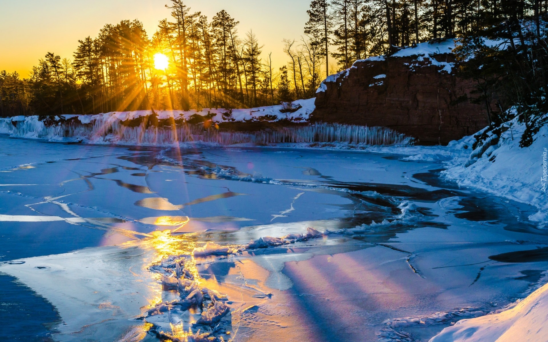 Edytor tapety: Rzeka, Lód, Skały, Las, Promienie, Słońca, Zima