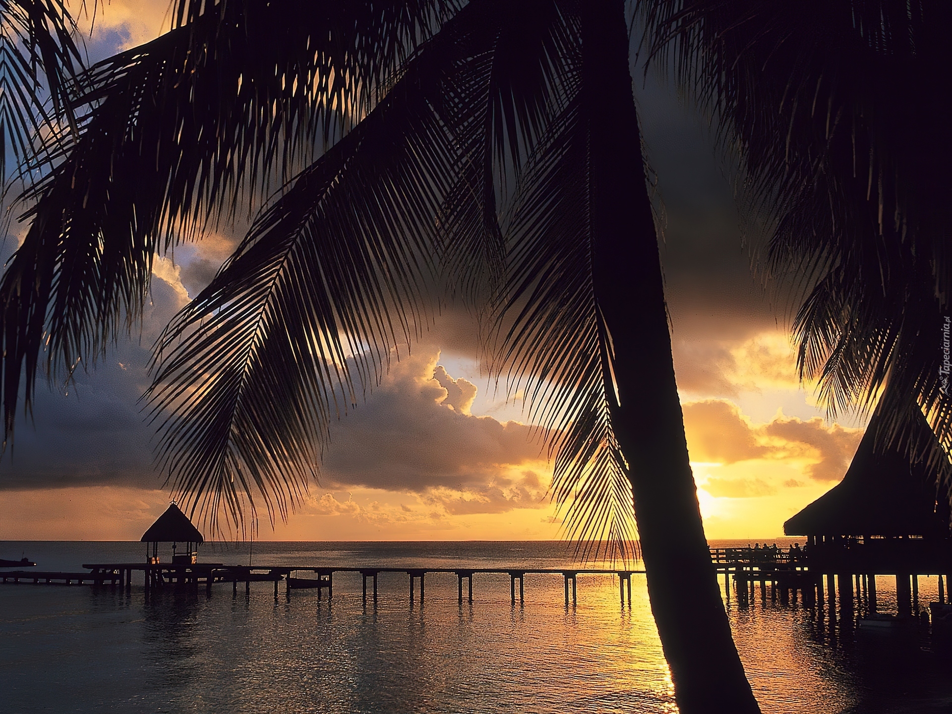 Edytor tapety: Pomost, Domki, Palma, Zachód, Słońca, Tropiki