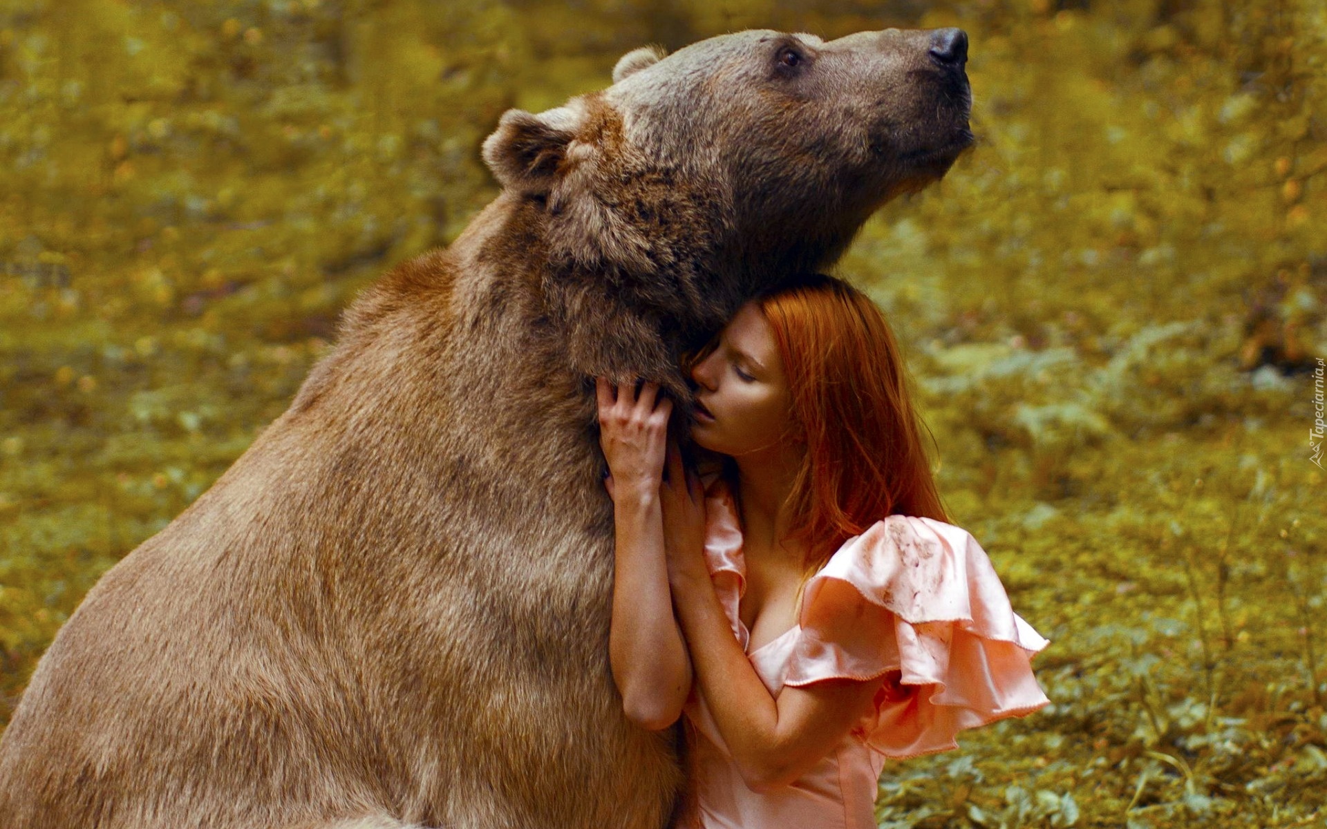 Edytor tapety: Dziewczyna, Niedzwiedz, Polana, Przyjazń