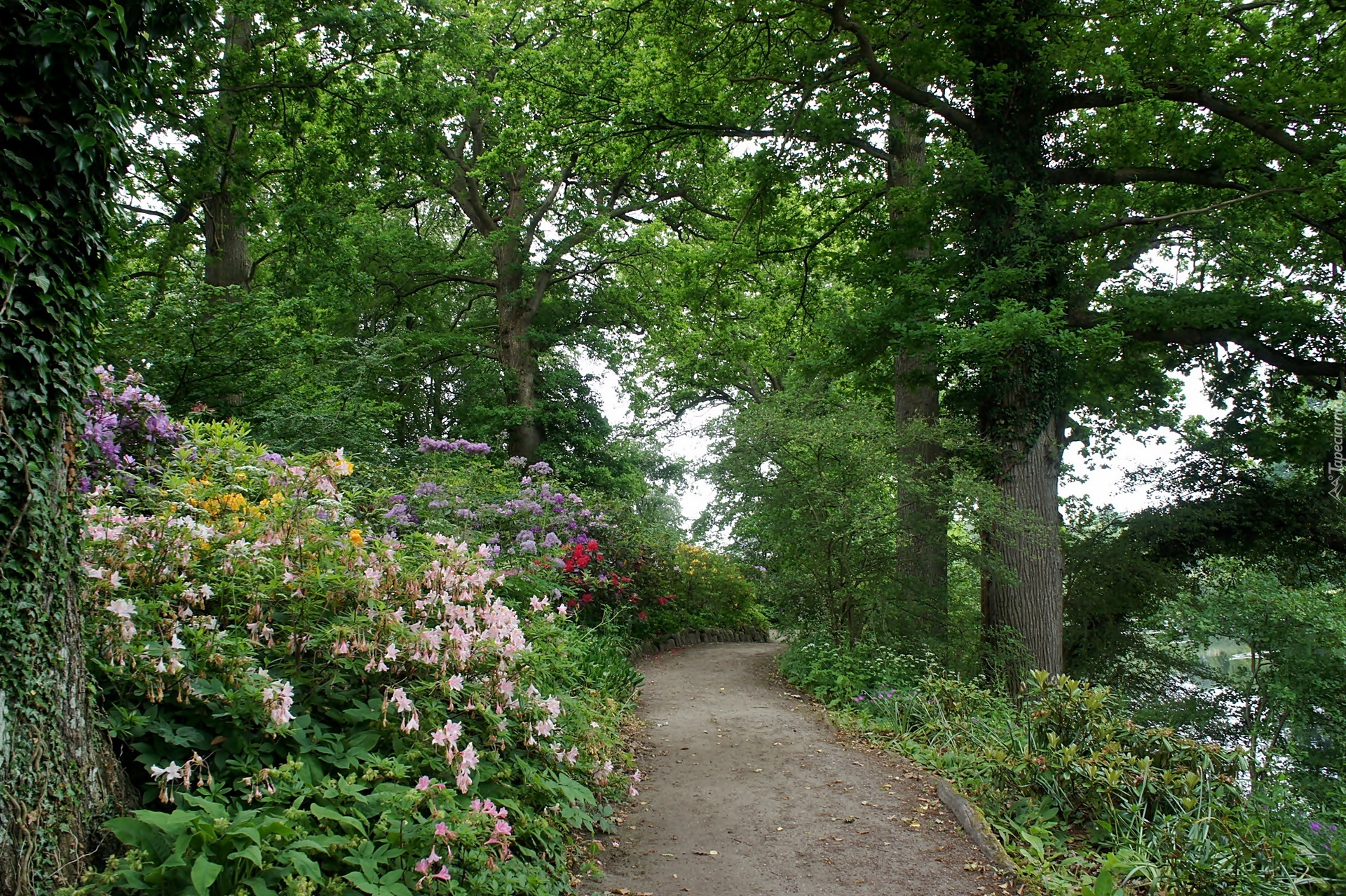 Edytor tapety: Wiosna, Dania, Grasten, Park w Grasten, Alejka, Kwitnące, Różaneczniki, Drzewa