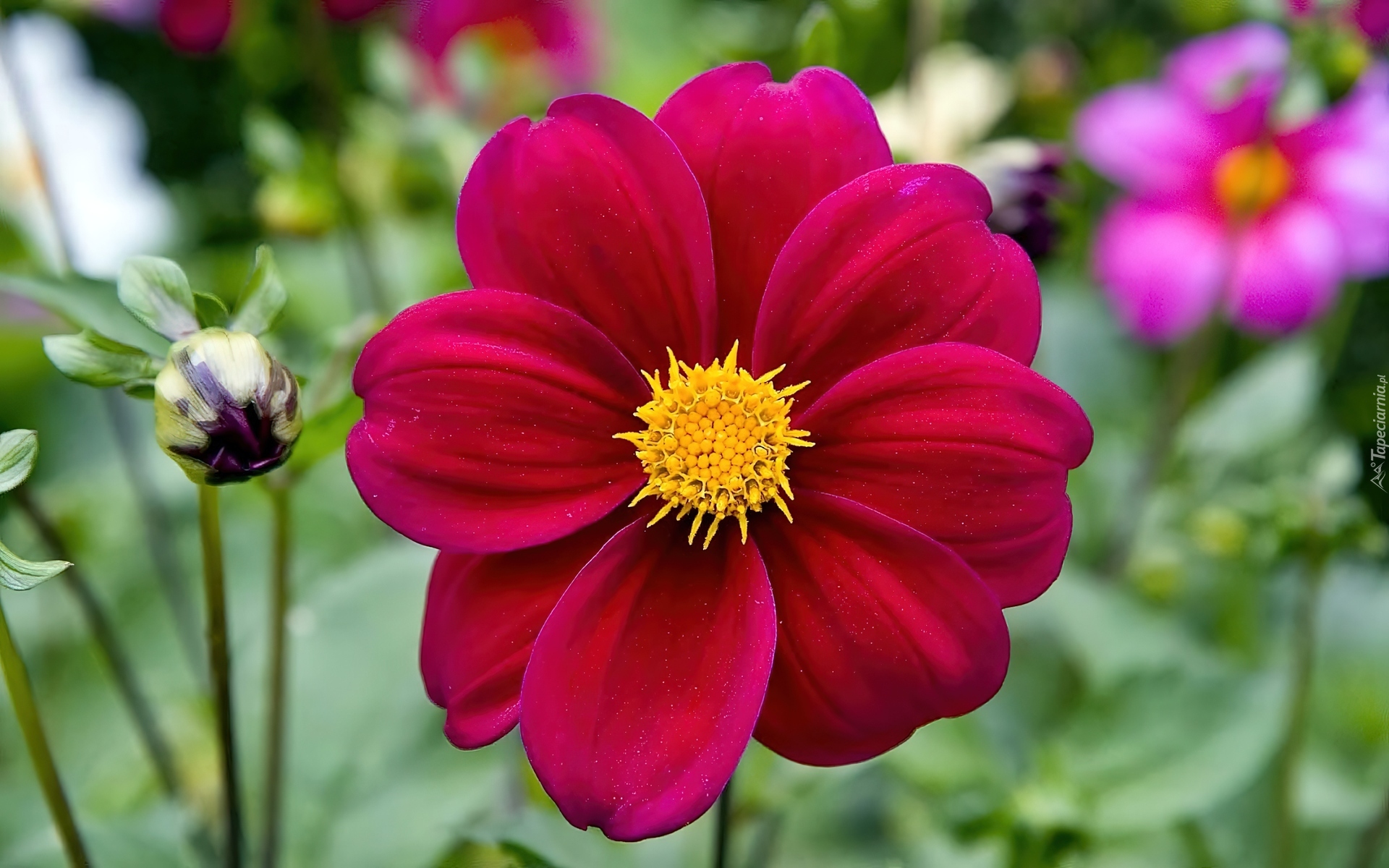 Edytor tapety: Lato, Ogród, Czerwona, Dalia, Rozmycie