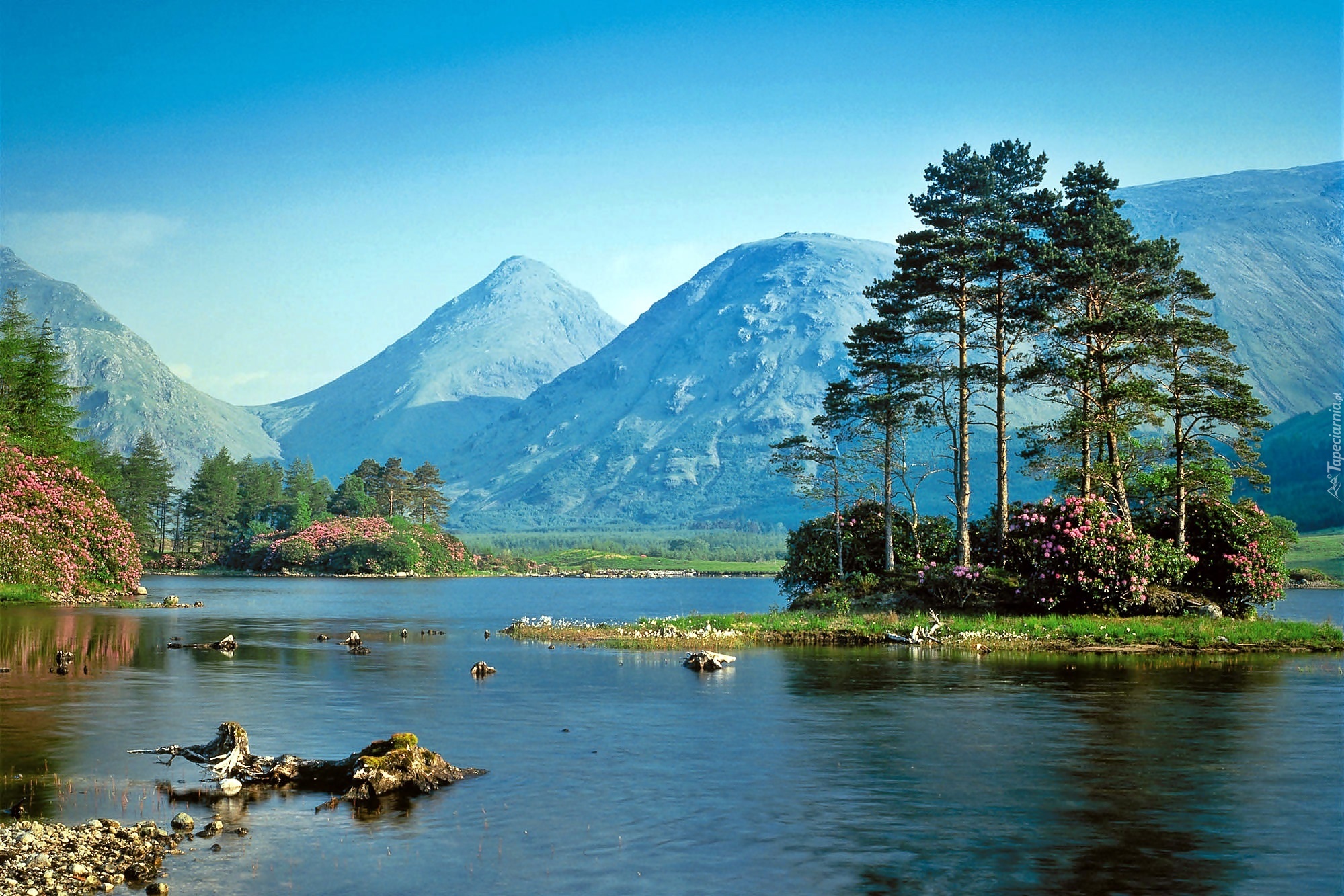 Edytor tapety: Góry, Lasy, Jezioro, Wysepka, Sosny, Rododendrony