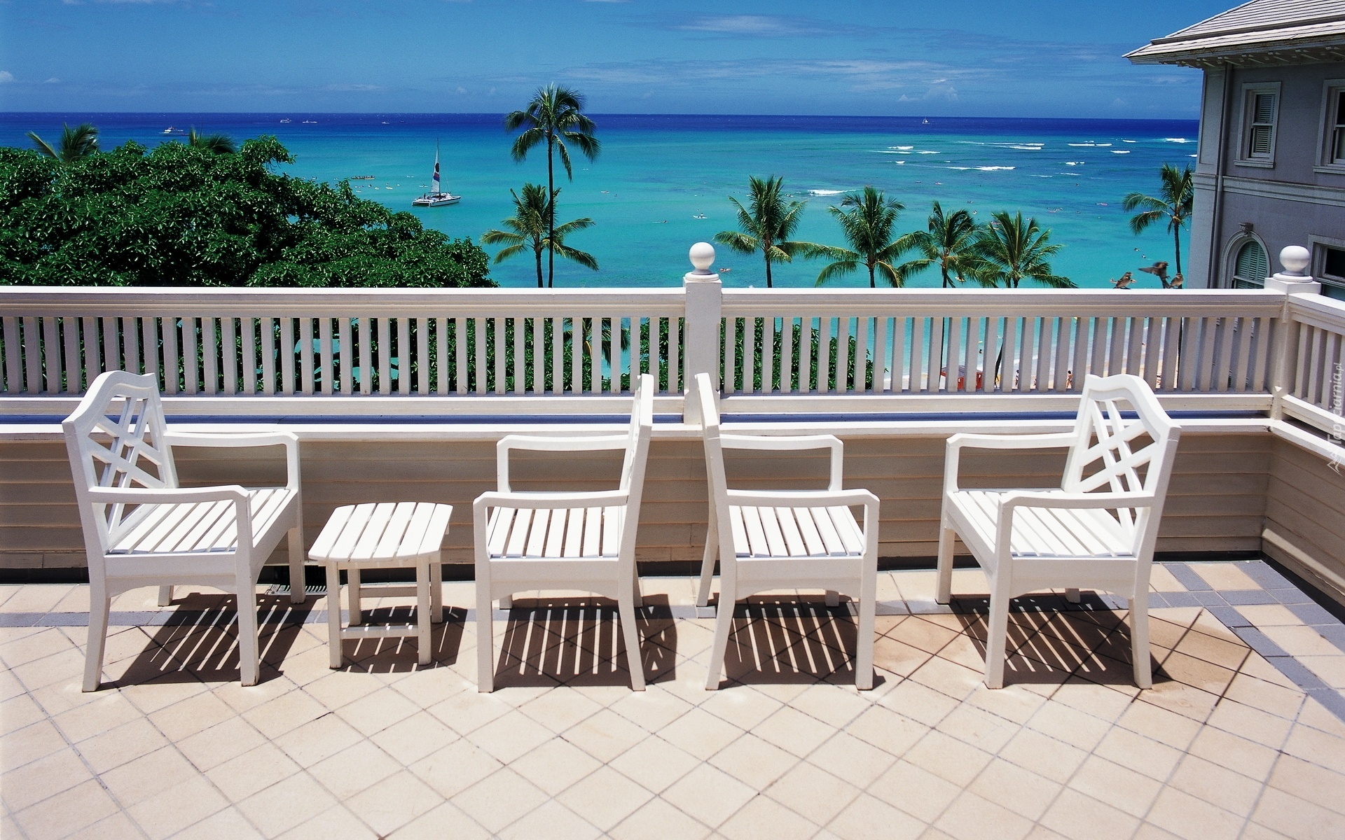 Edytor tapety: Dom, Taras, Krzesła, Morze, Palmy