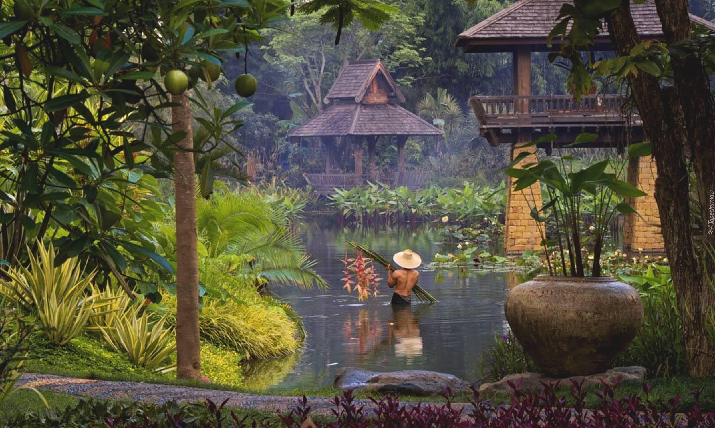 Edytor tapety: Ogród, Altana, Drzewa, Kwiaty, Staw, Mężczyzna