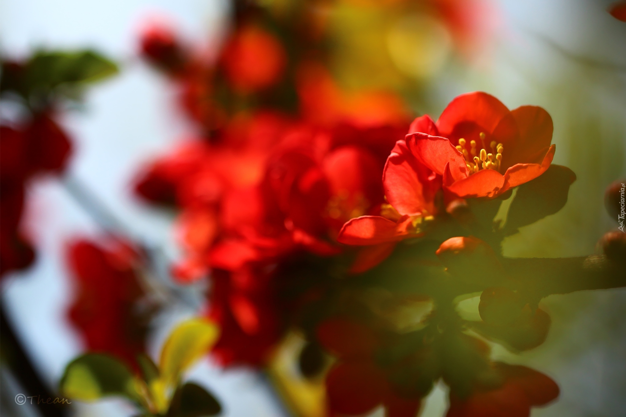 Edytor tapety: Krzew, Pigwowiec Japoński, Czerwone, Kwiaty