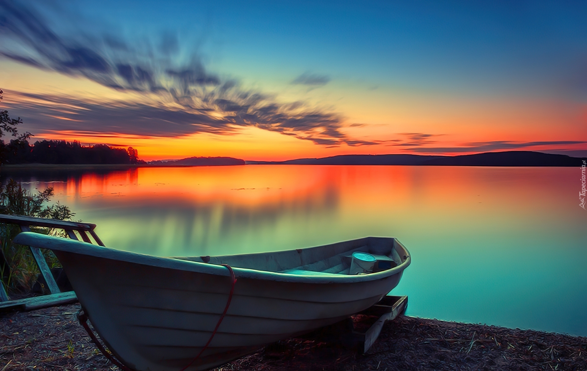 Edytor tapety: Zachód, Słońca, Jezioro, Łódka