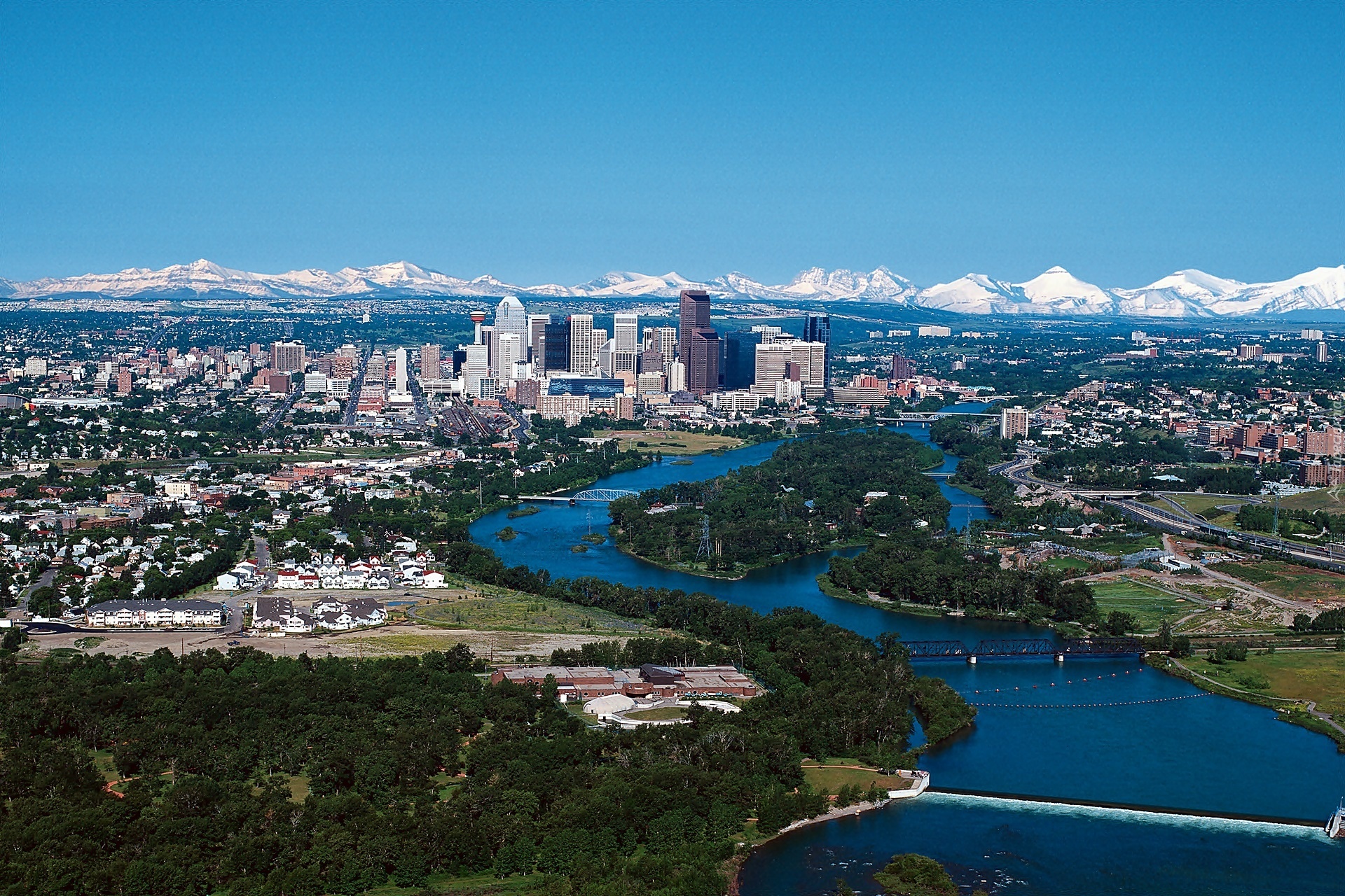 Edytor tapety: Calgary, Panorama, Miasta, Rzeka, Bow, Roślinność
