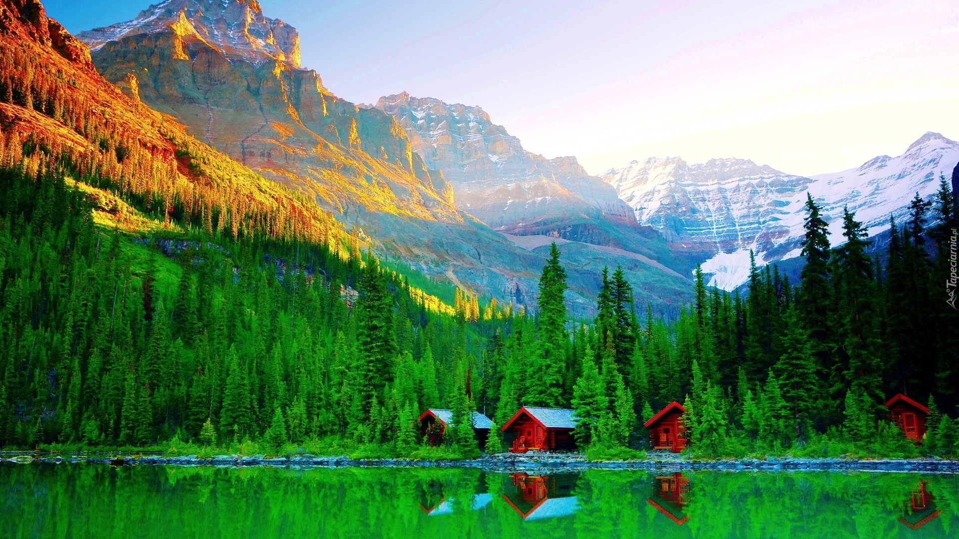 Edytor tapety: Góry, Lasy, Jezioro, Domki