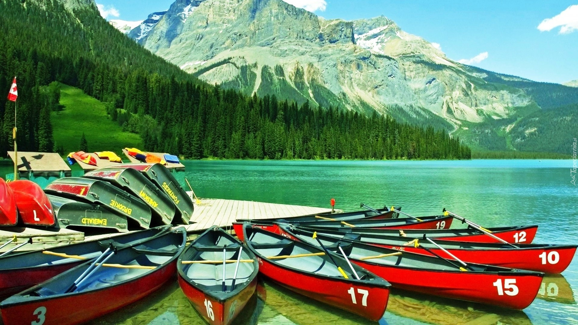 Edytor tapety: Kajaki, Pomost, Góry, Las, Jezioro, Esmerald, Kanada
