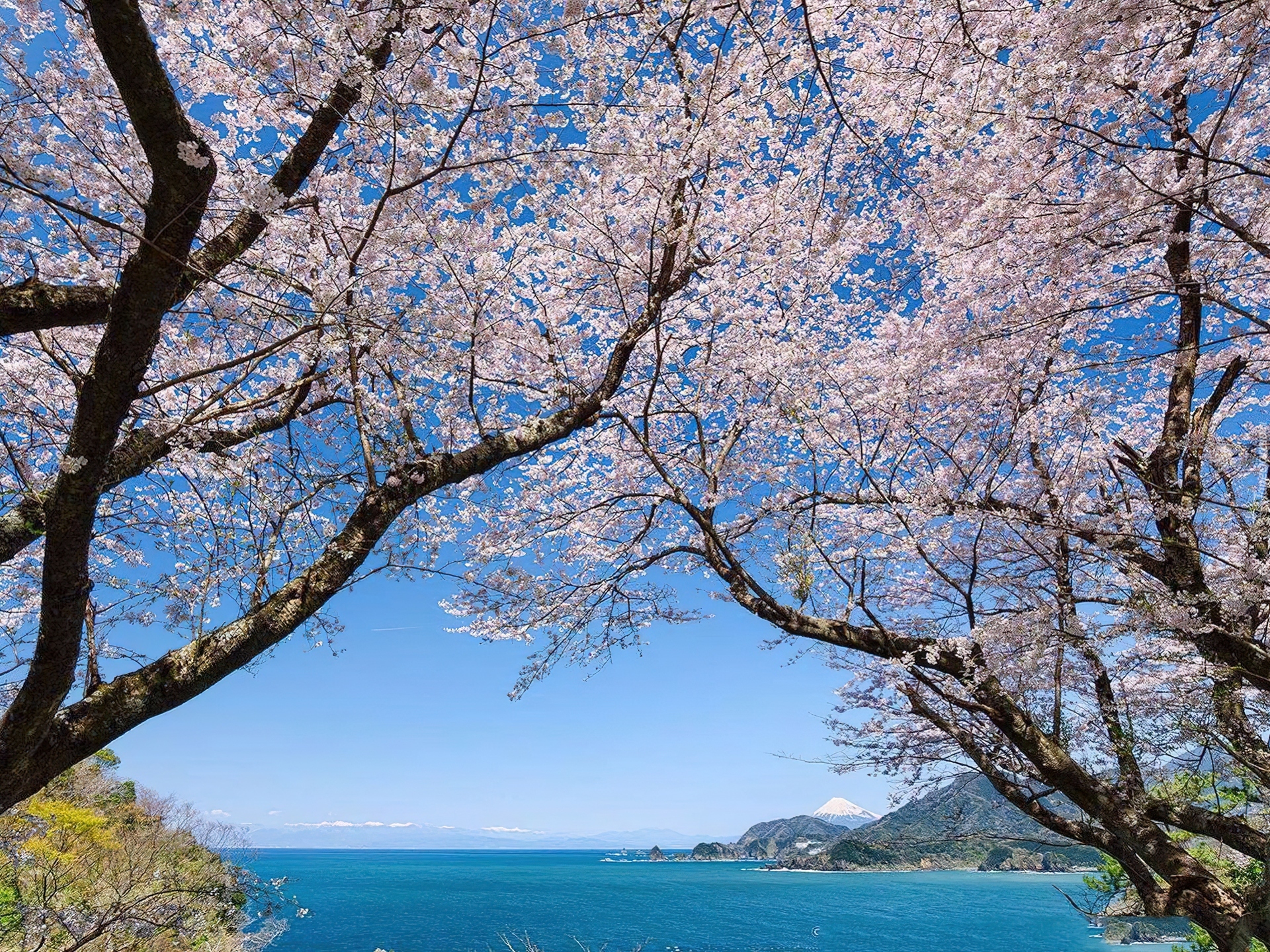 Edytor tapety: Kwitnące, Drzewa, Wybrzeże, Góry