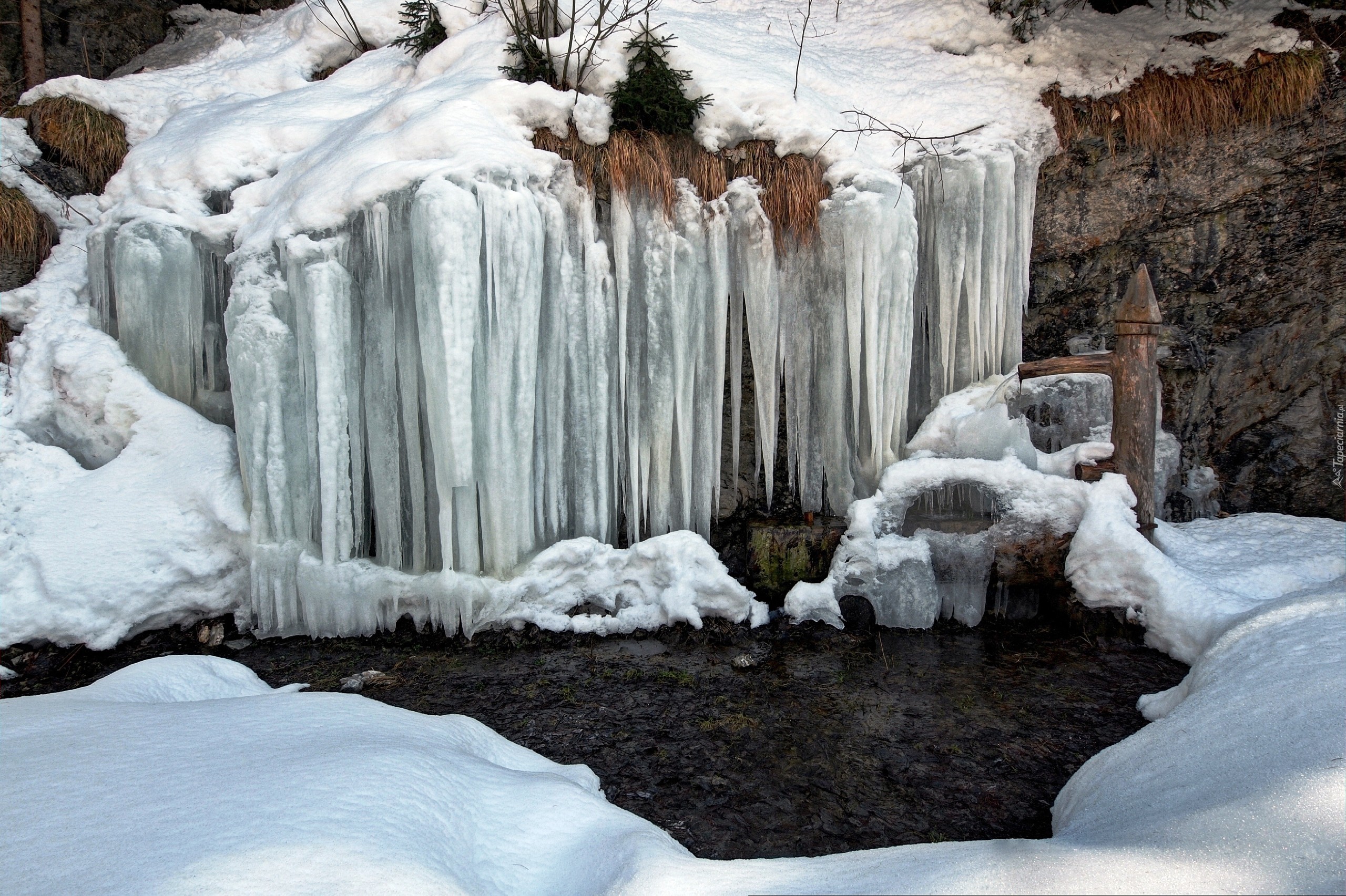 Edytor tapety: Jeziorko, Sople, Lodu, Zima