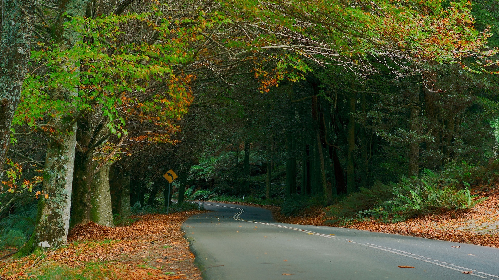 Edytor tapety: Droga, Las, Liście, Paprocie, Jesień