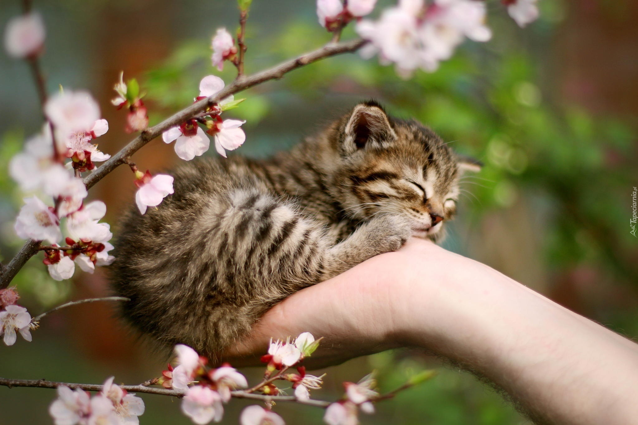 Edytor tapety: Śpiący, Kotek, Ręka, Wiosna, Kwitnące, Gałązki