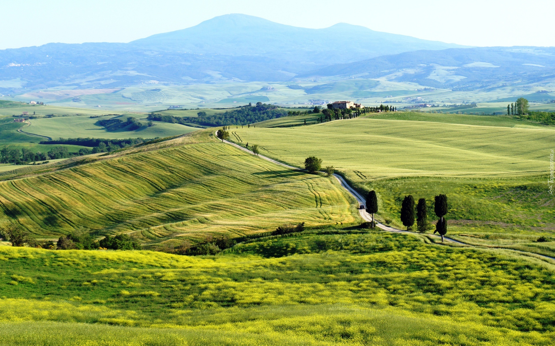 Edytor tapety: Łąki, Domy, Droga, Drzewa, Góry, Toskania, Włochy
