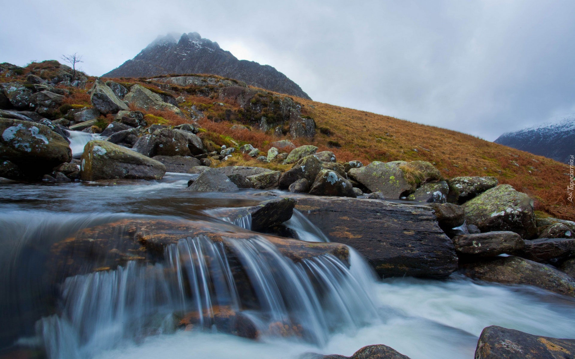 Edytor tapety: Góry, Zbocze, Rzeka, Głazy, Wodospad