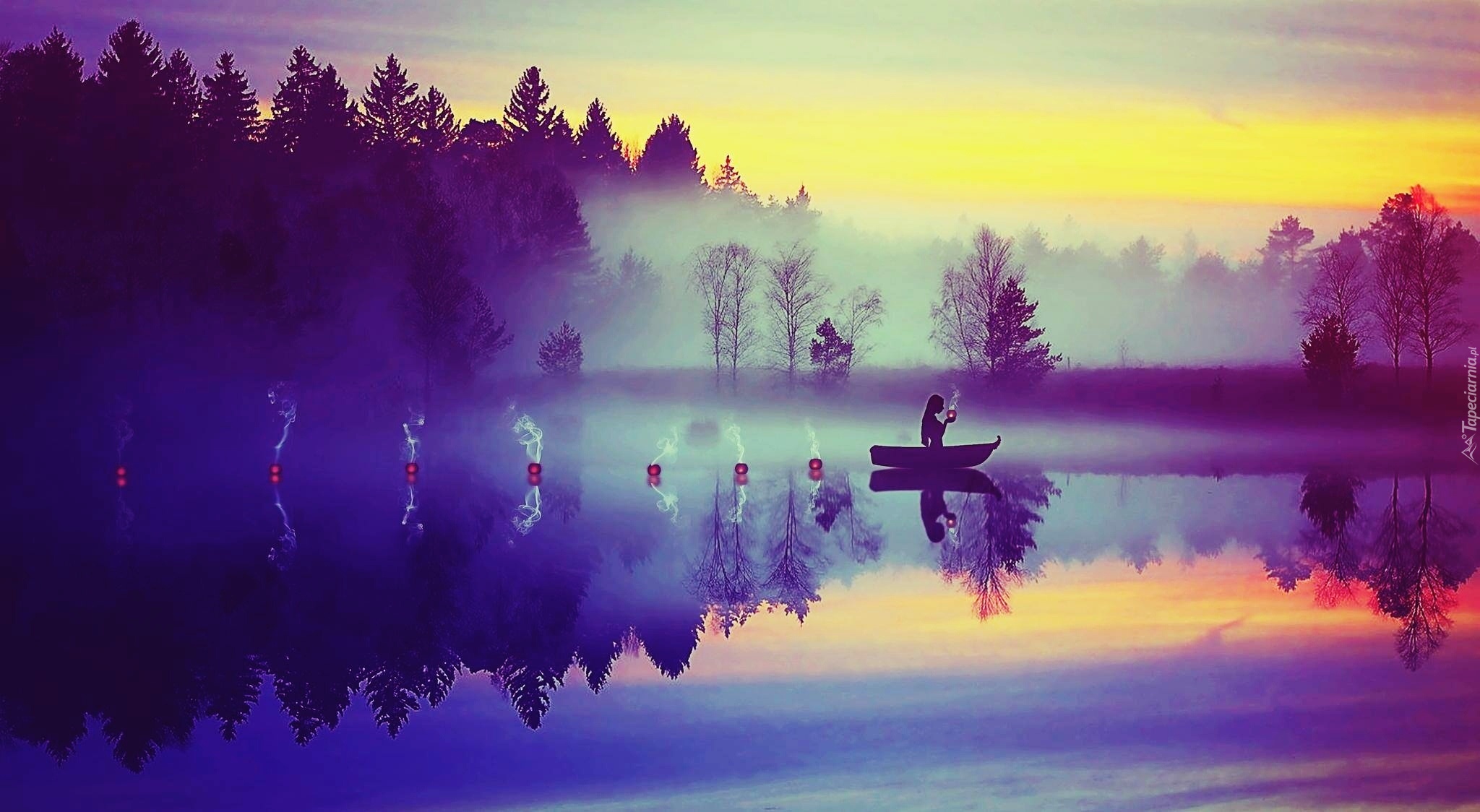 Edytor tapety: Jezioro, Drzewa, Mgła, Łódka, Kadzidełka , Zachód, Słońca