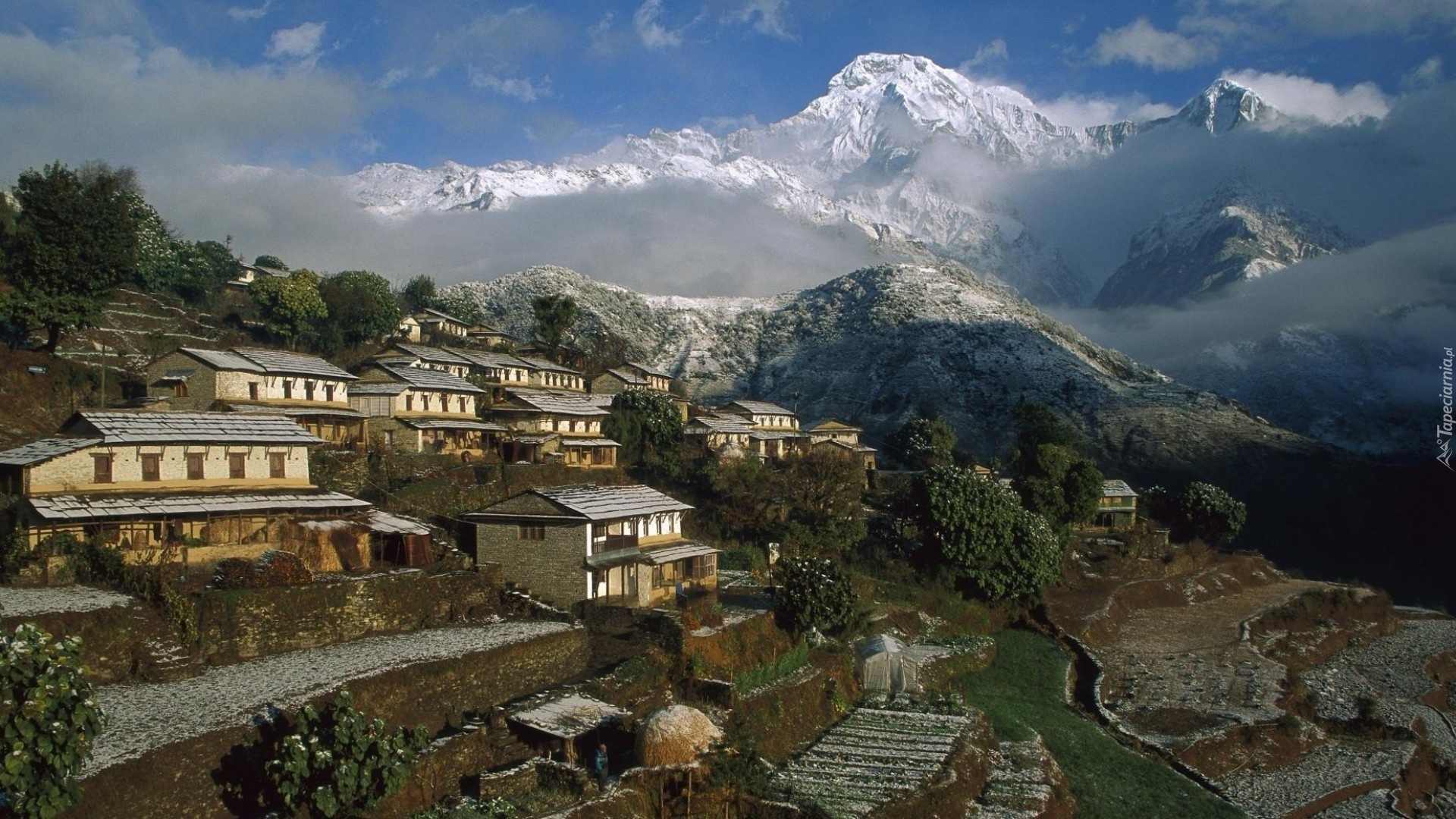 Edytor tapety: Nepal, Ghrung, Miasteczko, Domy, Góry