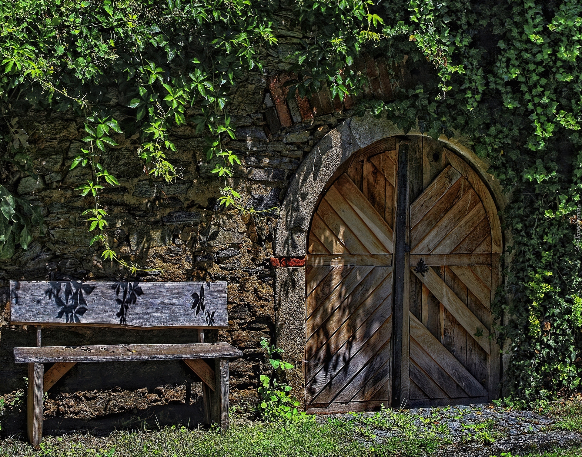 Edytor tapety: Ogródek, Mur, Liście, Brama, Drzwi, Ławka
