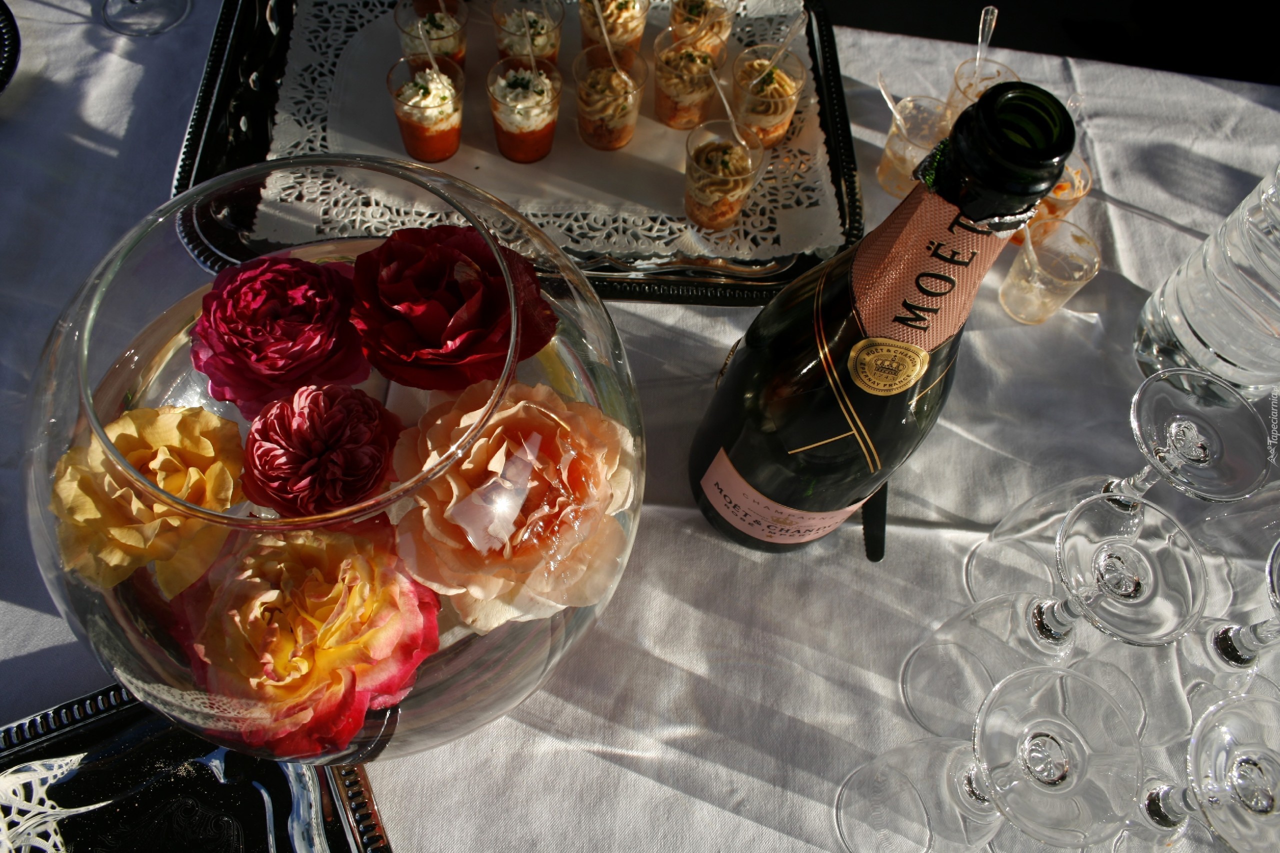 Edytor tapety: Szampan, Kieliszek, Róże, Taca, Deser